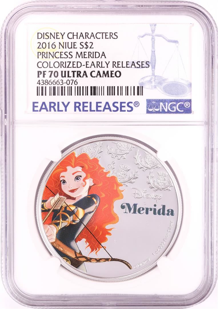 One 2016 Proof $2 Disney Princess Merida 1oz Silver Coin NGC PF70 Ultra Cameo. NGC Certified.