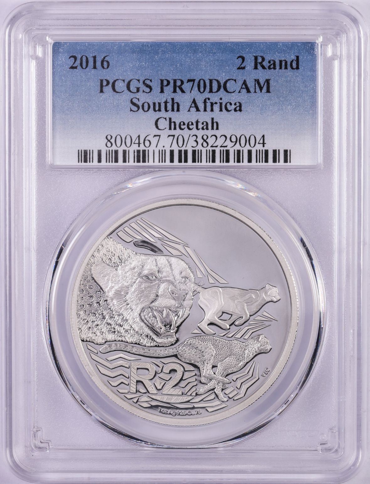 One 2016 Proof South Africa 2 Rand Cheetah Silver Coin PCGS PR70DCAM.