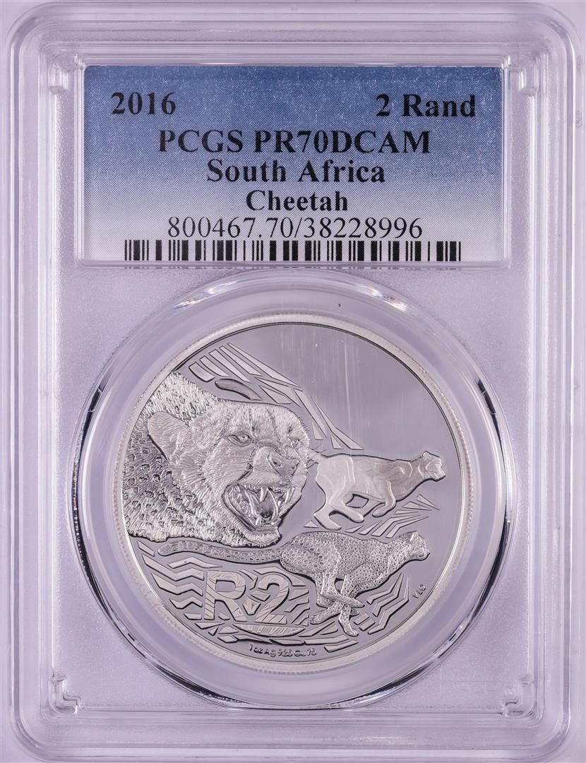 One 2016 Proof South Africa 2 Rand Cheetah Silver Coin PCGS PR70DCAM. PCGS Graded.