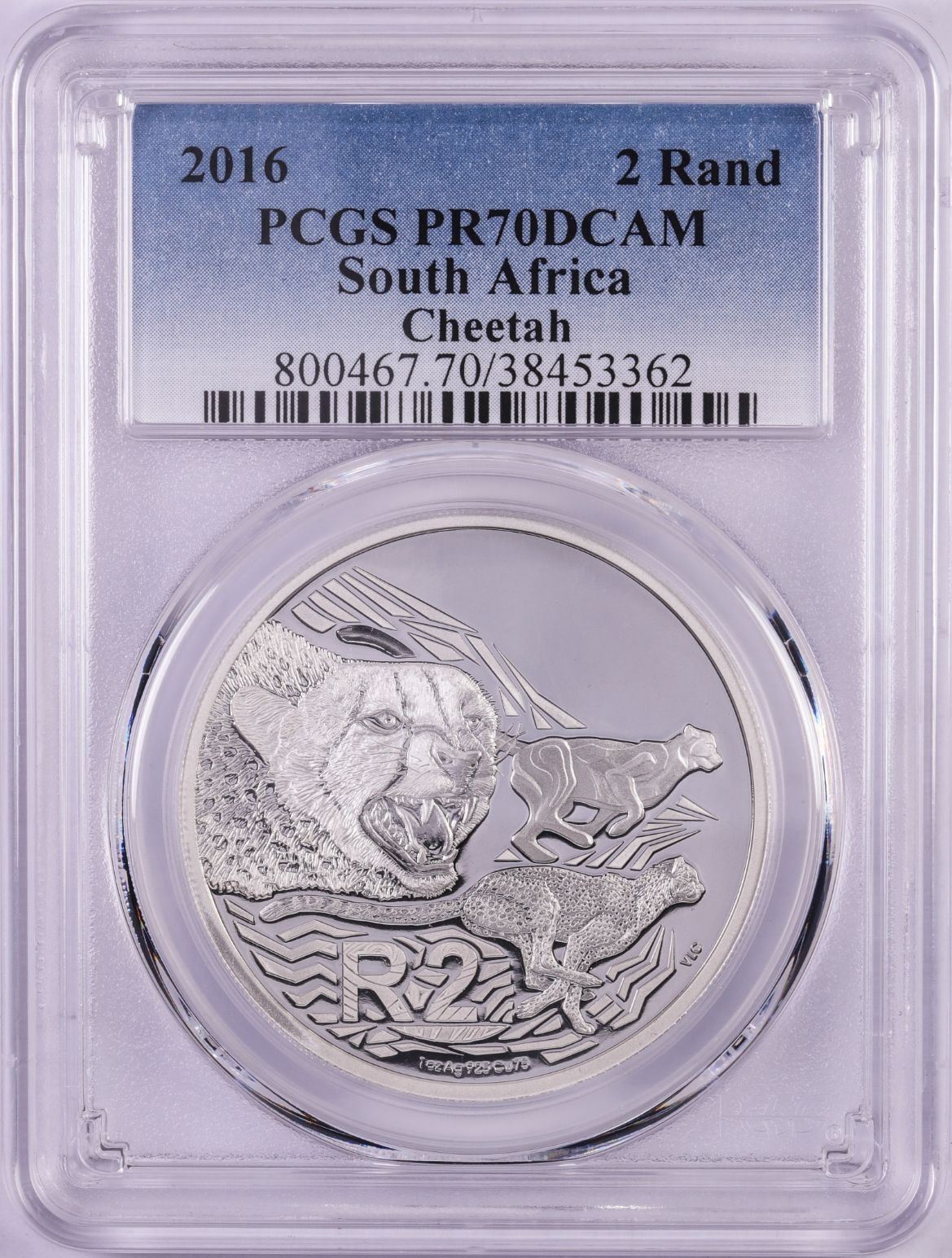 One 2016 Proof South Africa 2 Rand Cheetah Silver Coin PCGS PR70DCAM.
