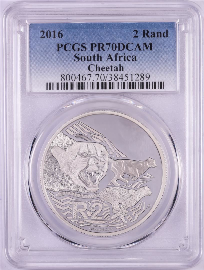 One 2016 Proof South Africa 2 Rand Cheetah Silver Coin PCGS PR70DCAM. PCGS Graded.