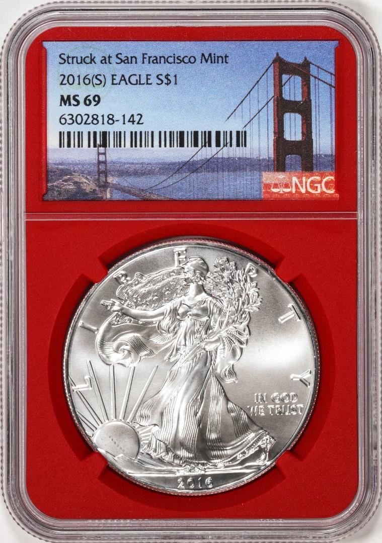 One 2016-(S) $1 American Silver Eagle Coin NGC MS69 Struck at San Francisco Red Core. NGC Certified.