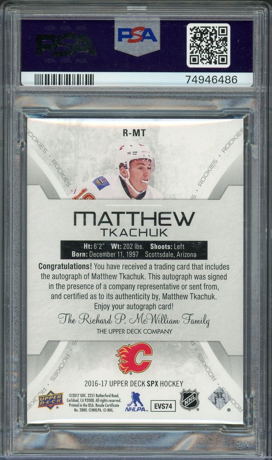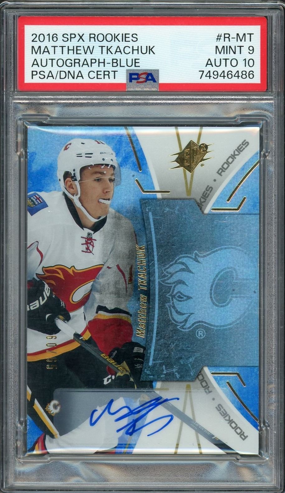 2016-17 SPX Rookies Blue autograph of current Florida Panthers star Matthew Tkachuk graded a (low pop) mint 9/auto 10 by PSA!