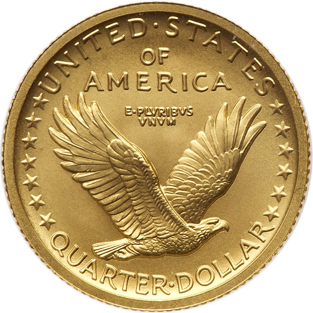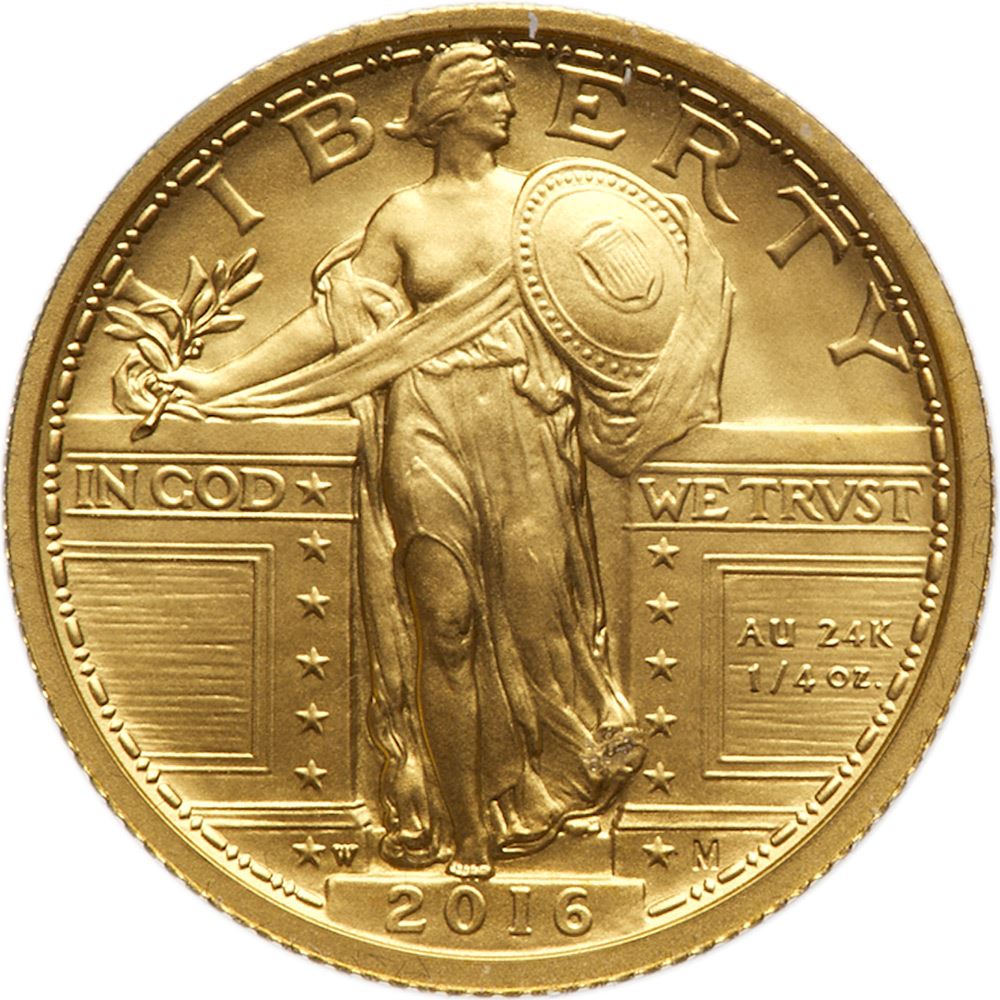 2016 Standing Liberty Quarter Gold Coin. Gem UNC. Contains 1/4 oz of 24k gold. A popular centennial revival of the great American Renaissance coinage series. Housed in the original box of issue. Estimated Value 375 - 400