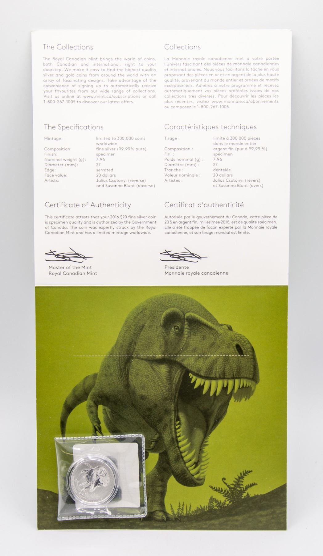 2016 T-REX RCM FINE SILVER $20 COIN PROOF MINT