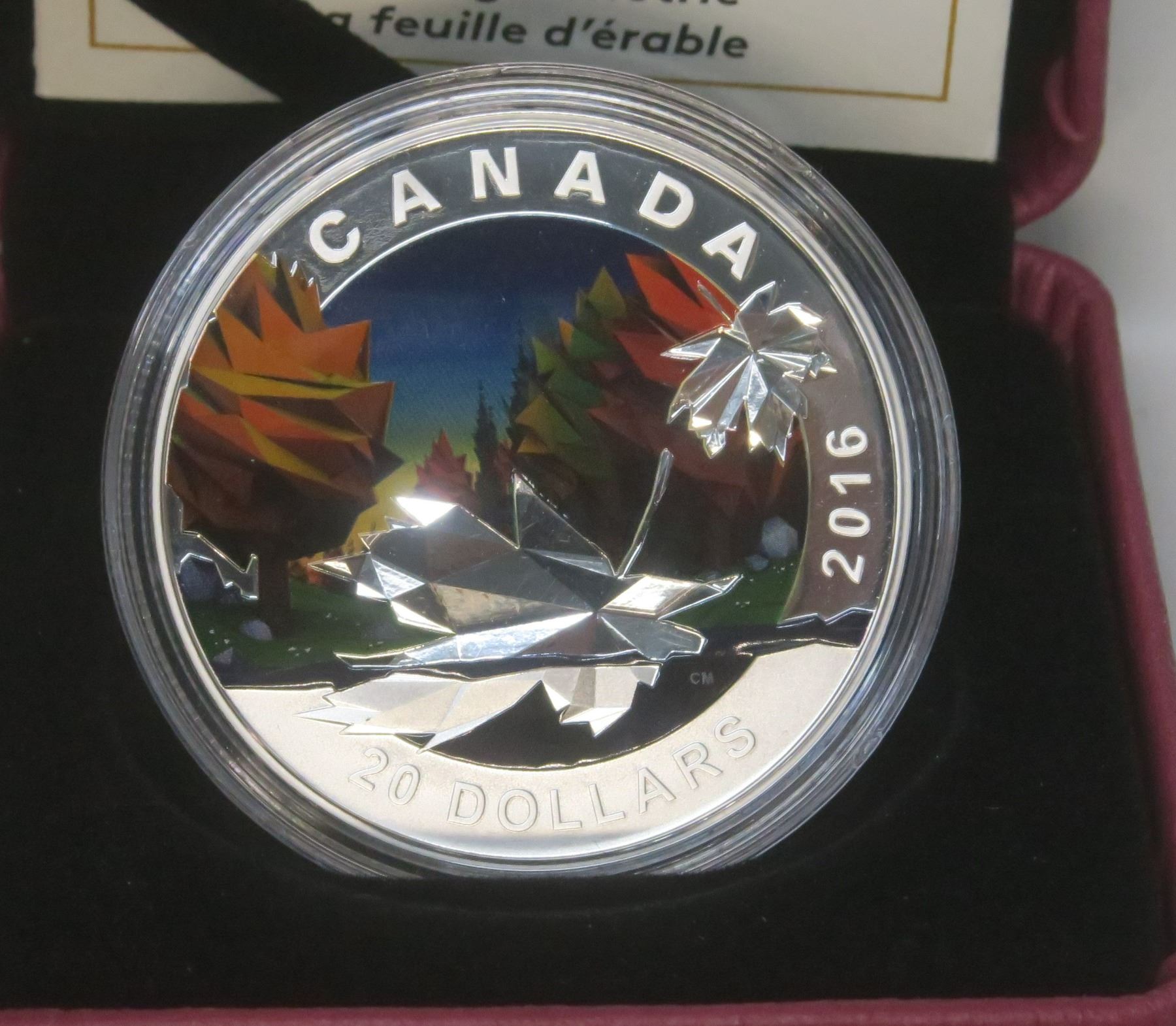2016 The Coloured Maple Leaf $20. 99.99% pure Silver. Proof with Ultra Heavy Cameo. Housed in its original case of issue.