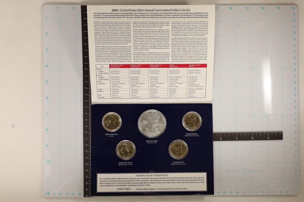 2016-W AMERICAN SILVER EAGLE, 2016-D NATIVE AMERICAN DOLLAR AND 3-2016-P PRESIDENTIAL DOLLARS. IN ORIGINAL US MINT PACKAGING
