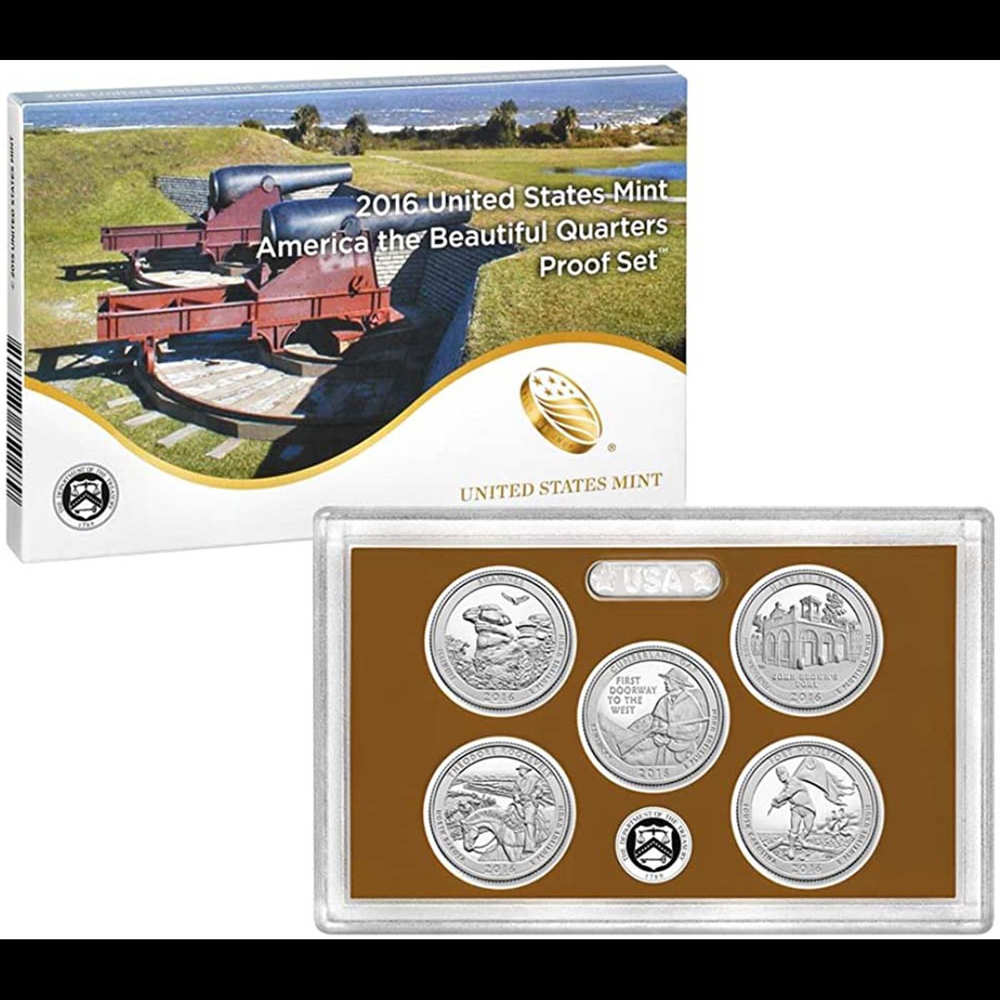 2016 United States America The Beautiful Quarters Silver Proof Set; 14 pcs . The 2016-S set includes 5 Washington quarters Shawnee National Forest in Illinois Cumberland Gap National Historic Park in Kentucky Harpers Ferry National Historical Park in West Virginia Theodore Roosevelt National Park in North Dakota Fort Moultrie at Fort Sumter National Monument in South Carolina