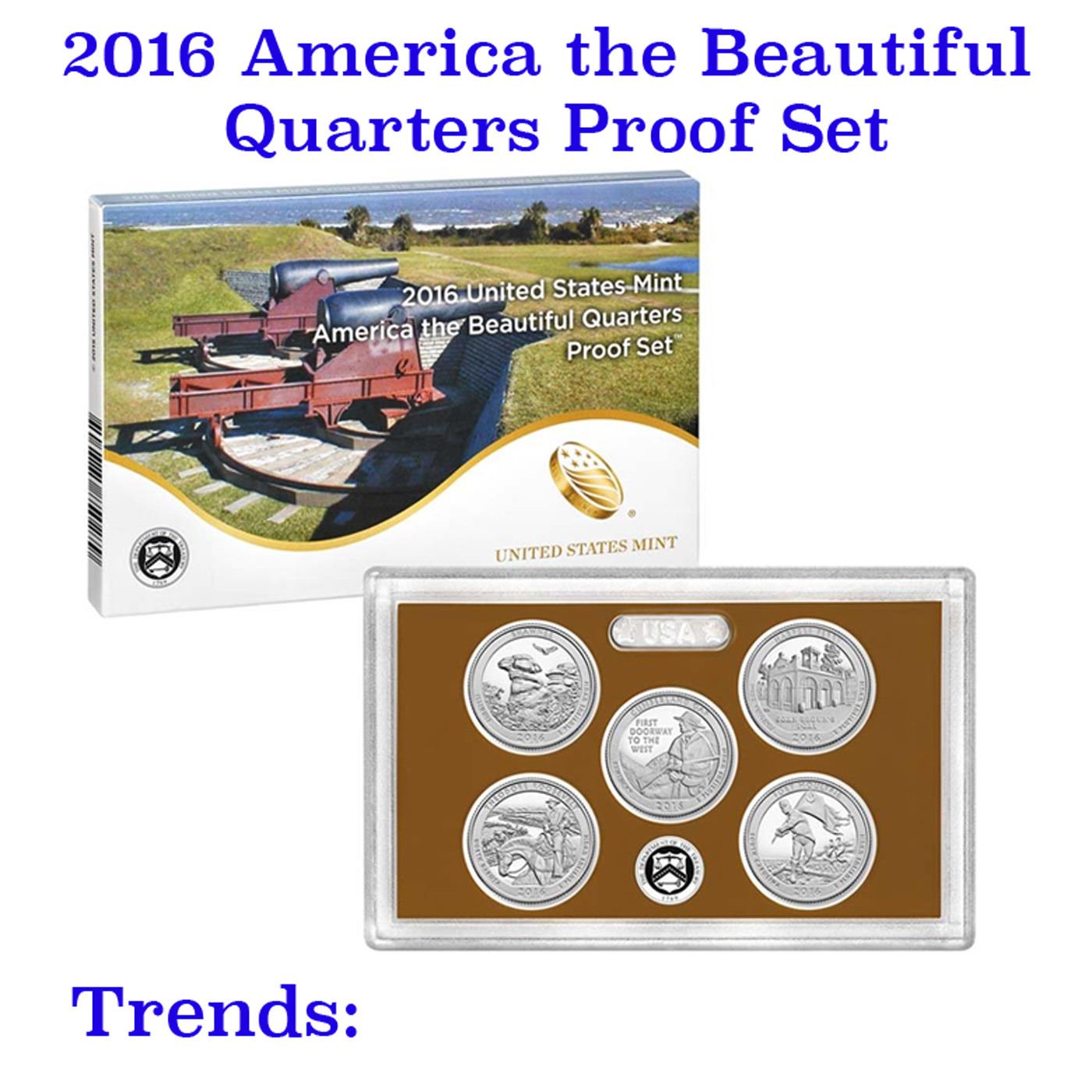 2016 United States Mint America The Beautiful Quarters Proof Set 5 coins. All five 2016 America the Beautiful Quarters proof set finish, protectively encased in a clear plastic lens and outer packaging. U.S. Mint proof coins feature sharp relief and a mirror–like background. Their frosted, sculpted foregrounds give them an exceptional cameo effect. Proof blanks are specially treated, polished and cleaned to ensure high quality strikes. The blanks are then fed into presses fitted with specially polished dies and struck at least twice to ensure sharp relief. The coins are then packaged in a protective lens to showcase and maintain their exceptional finish. The 2016 edition of the United States Mint America the Beautiful Quarters Proof Set features the seventh annual release of five quarters in the series. Each coin in this series features a common obverse (heads) with the 1932 portrait of George Washington by John Flanagan, restored to bring out subtle details and the beauty of the original model. Inscriptions are “UNITED STATES OF AMERICA,” “LIBERTY,” “IN GOD WE TRUST” and “QUARTER DOLLAR.” The 2016 reverse (tails) of these coins honor the sites below with the following designs: Shawnee National Forest in Illinois Cumberland Gap National Historic Park in Kentucky Harpers Ferry National Historical Park in West Virginia Theodore Roosevelt National Park in North Dakota Fort Moultrie at Fort Sumter National Monument in South Carolina The U.S. Mint launched the America the Beautiful Quarters Program in 2010. The 12–year initiative includes 56 quarters featuring reverse designs depicting some of our most cherished national parks and other national sites. The U.S. Mint will issue five new quarter designs per year, with one final design in 2021. The seventh year of the program, 2016, features the seventh group of five quarters in the series.