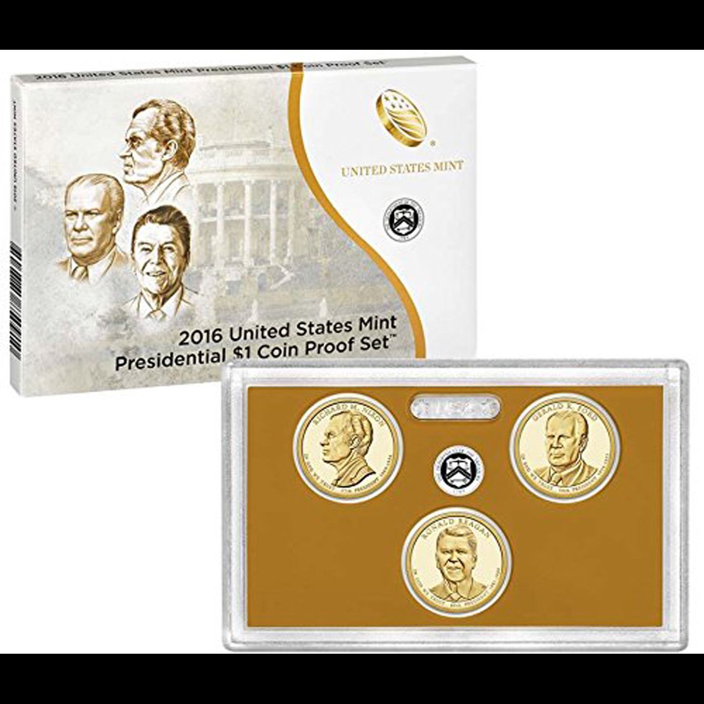 2016 United States Mint Presidential $1 Proof Set; 3 pcs . The set contains three Presidential $1 Coins in proof condition with the portraits of Presidents Richard M. Nixon, Gerald R. Ford, and Ronald Reagan on their obverse (heads sides). All coins were struck at the United States Mint at San Francisco.