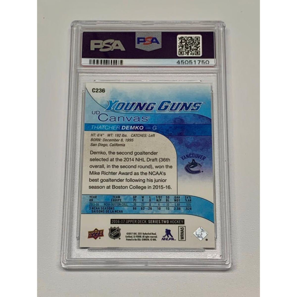 2016 Upper Deck Young Guns Canvas #C236 Thatcher Demko 10 - GEM MT. Please view photos for further details.Â