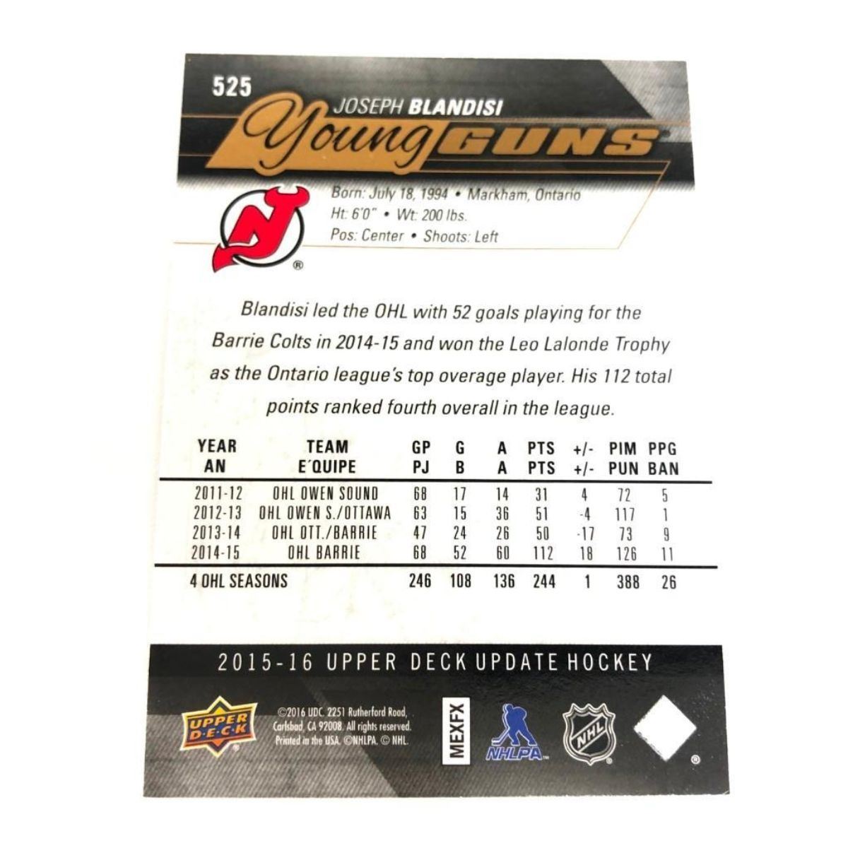 2016 Upper Deck Young Guns Limited High Gloss 04/10 Joseph Blandsi Rookie Card. Please View Photos For Further Details.Â
