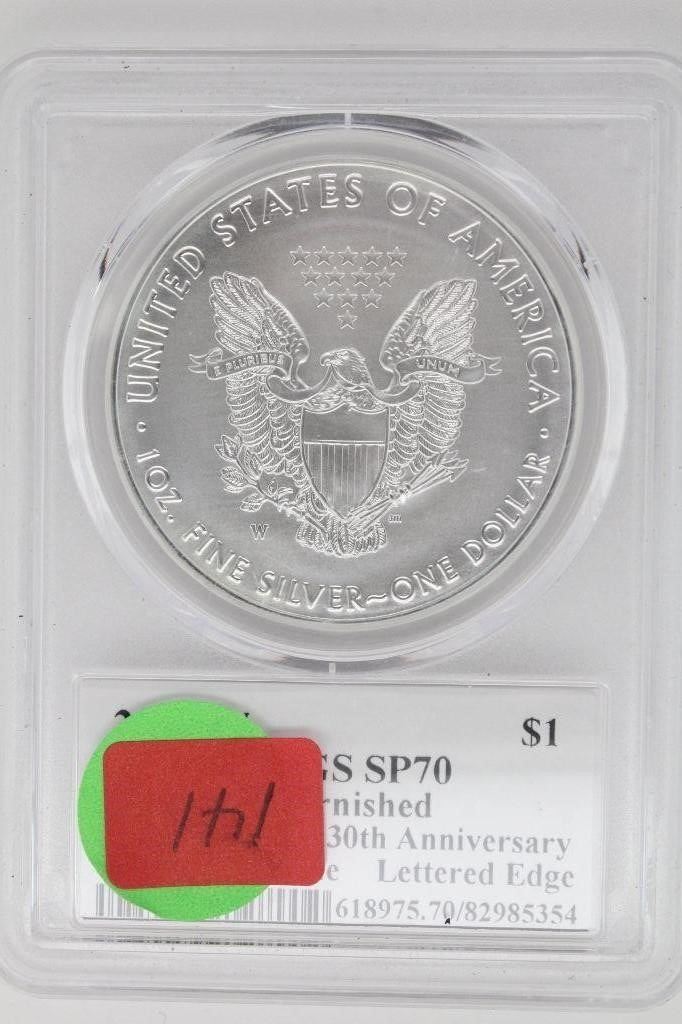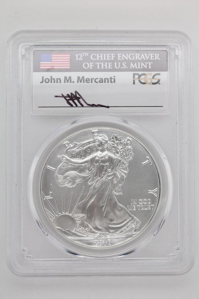 A John Mercanti Signed 2016-W $1 AMERICAN SILVER EAGLE, BURNISHED STRIKE, LETTERED EDGE PCGS graded, a perfect SP70. A great one year type (lettered edge coin).