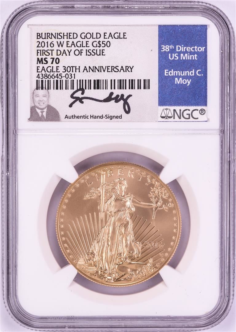 One 2016-W $50 Burnished American Gold Eagle Coin NGC MS70 FDOI Moy Signature. NGC Certified.