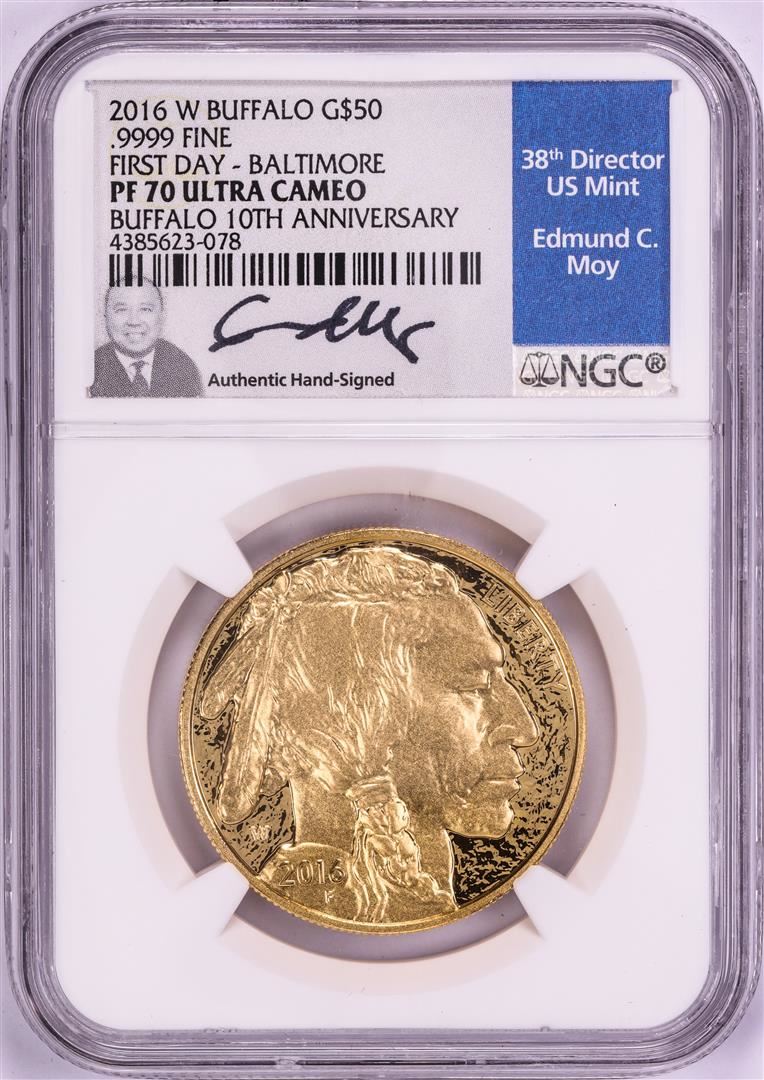 One 2016-W $50 Proof American Buffalo Gold Coin NGC PF70 First Day Moy Signature Baltimore. NGC Certified.