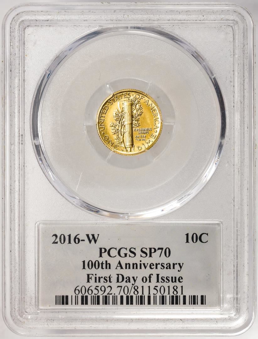 One 2016-W Mercury Dime Centennial Commemorative Gold Coin PCGS SP70 FDOI Weinman Sig. PCGS Graded.