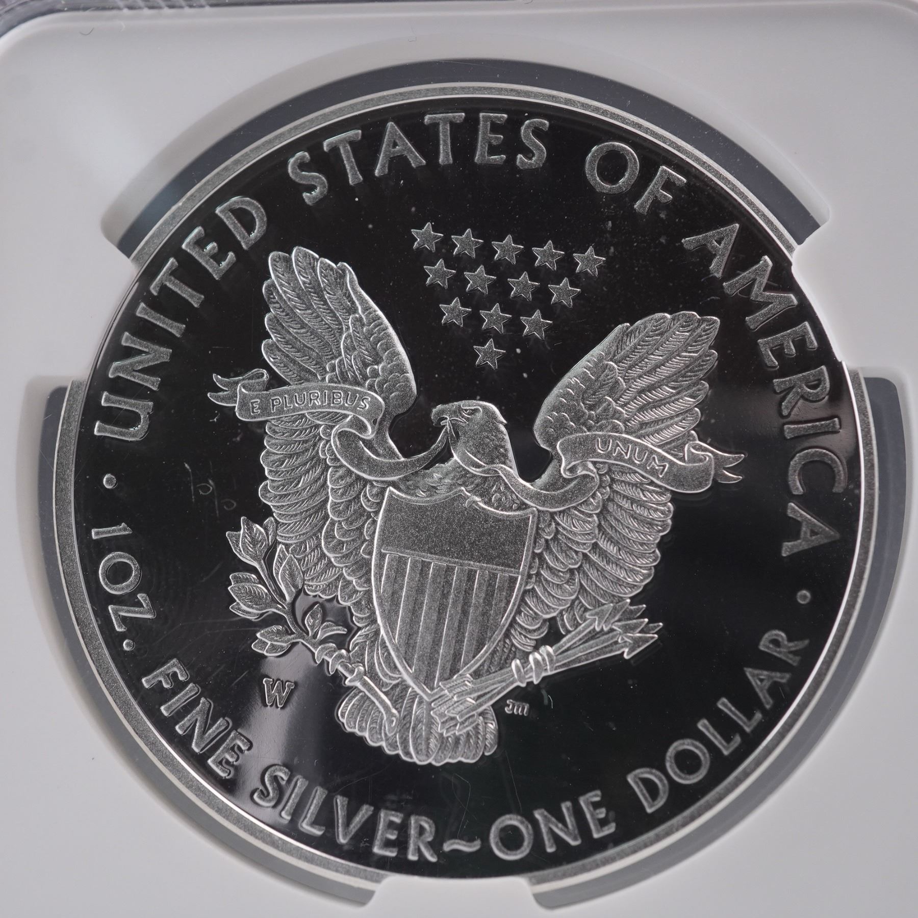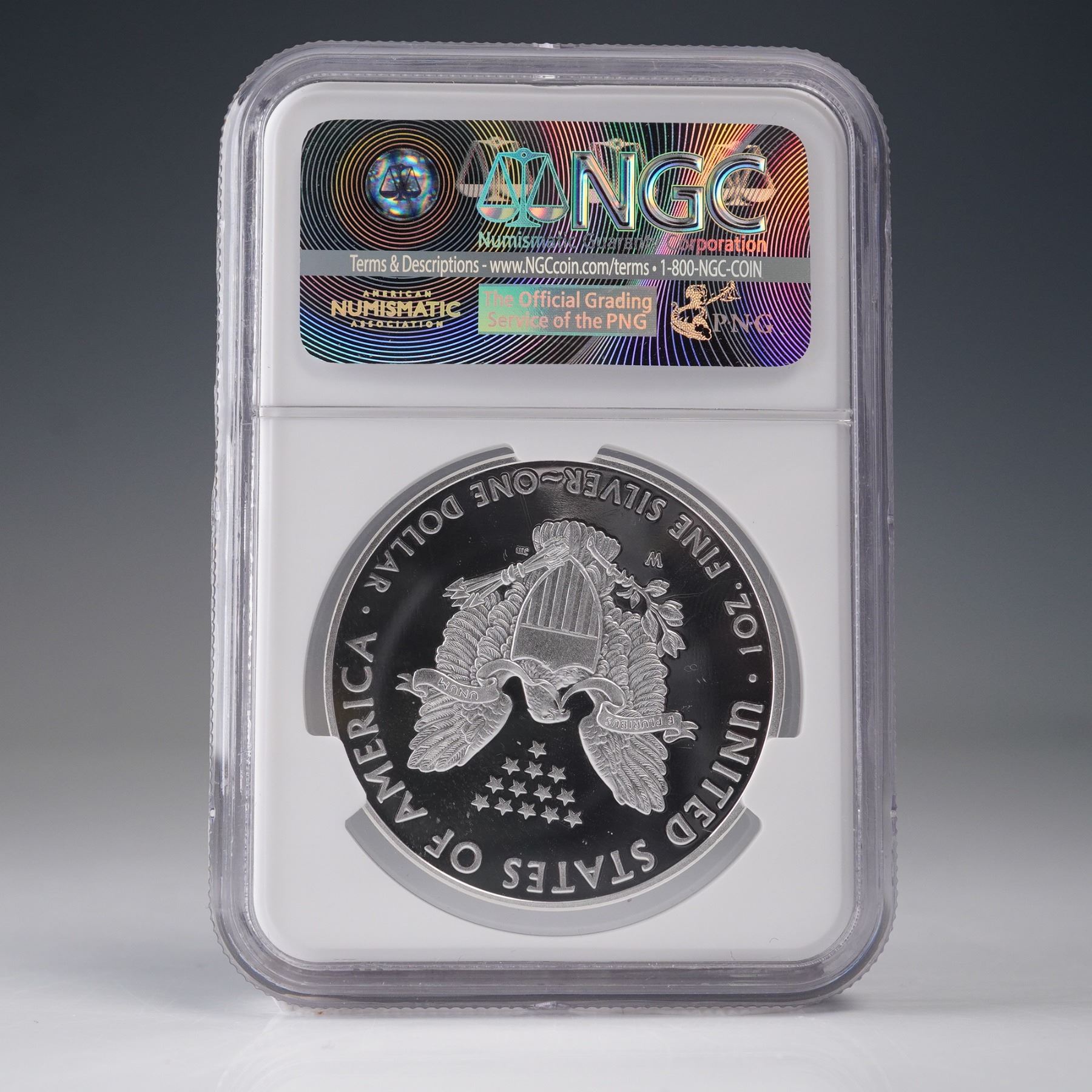 2016 American Silver Eagle Proof coin struck at the West Point Mint, commemorating the 30th Anniversary of the Silver Eagle series. This official United States Mint issue features a mirrored proof finish and a special lettered edge inscription unique to this anniversary year. The obverse design showcases Adolph A. Weinman's "Walking Liberty" motif, originally used on the half dollar from 1916 to 1947, with inscriptions including "LIBERTY," "IN GOD WE TRUST," and the year "2016." The reverse design by John Mercanti features a heraldic eagle with a shield, an olive branch in the right talon, and arrows in the left, with thirteen stars above representing the original colonies. Graded by NGC as PF 70 Ultra Cameo under their "Early Releases" designation, this coin is certified as having been received by NGC within 30 days of the coin's release. The label further notes the 30th Anniversary edge inscription. This example bears the "W" mintmark denoting West Point Mint origin. Denomination of one dollar. Composition: 1 oz .999 fine silver. Comes encapsulated in an official NGC tamper-evident holder. Slab: 2.25"L x 0.5"W x 3.25"H. Coin diameter: 39mm.