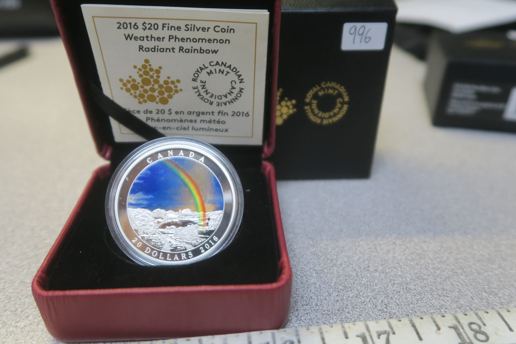 2016 Weather Phenomenon: Radiant Rainbow $20. Coloured Rainbow. 99.99% pure Silver. Proof with Ultra Heavy Cameo. Housed in its original RCM case & box of issue.