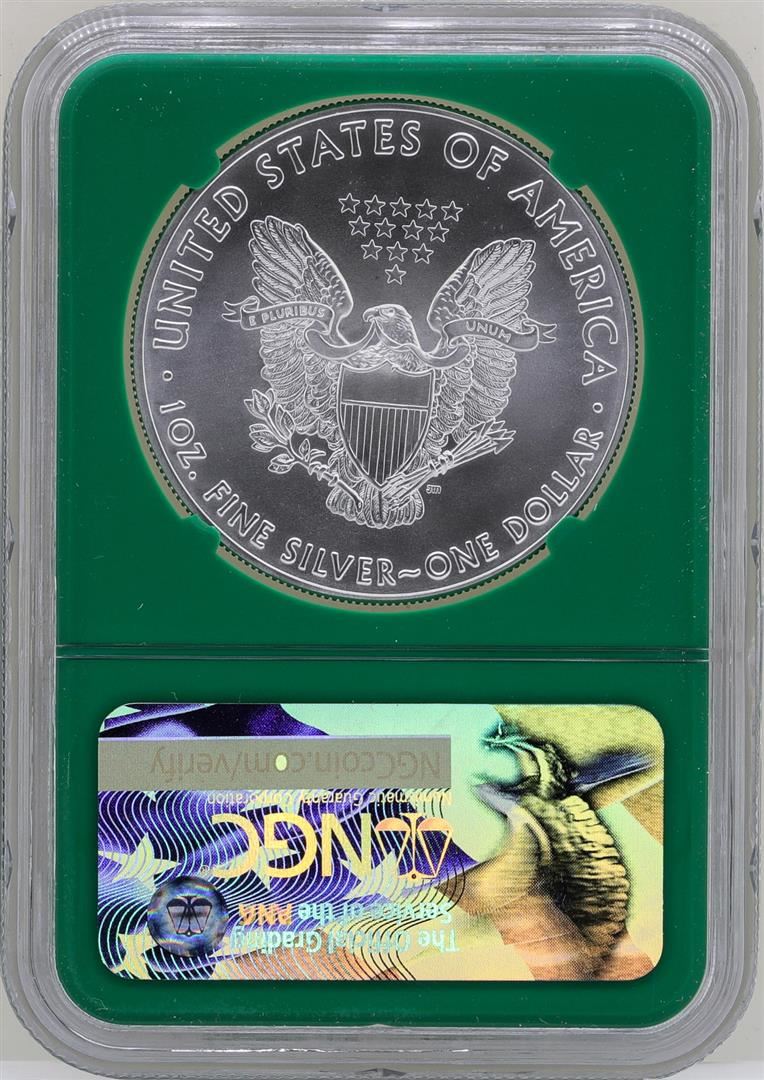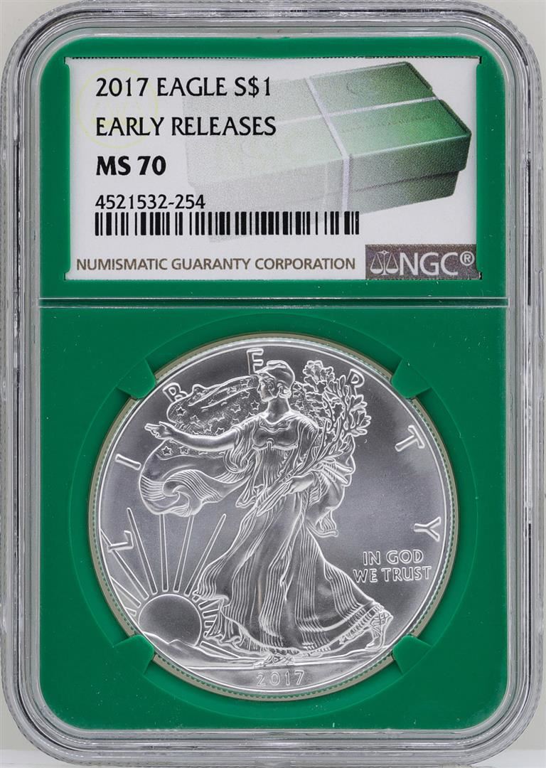 One 2017 $1 American Silver Eagle Coin NGC MS70 Early Releases Green Core. NGC Certified.
