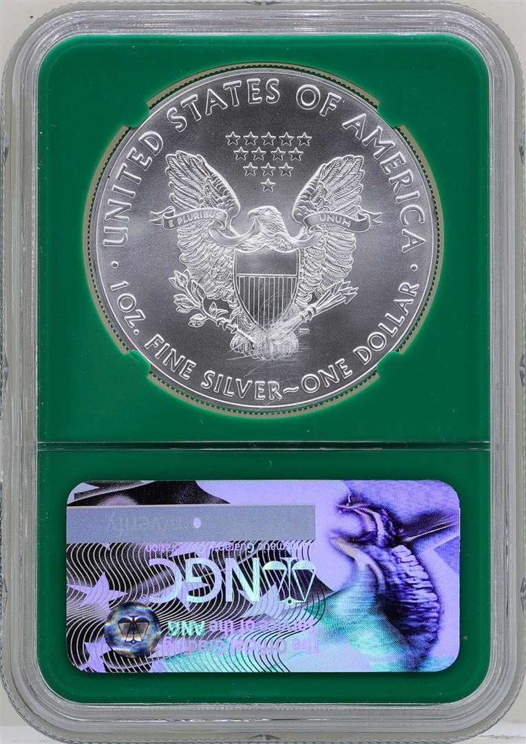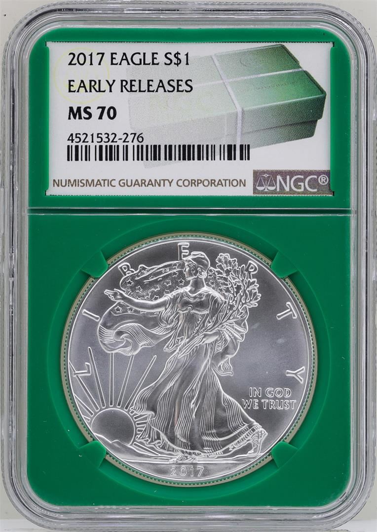 One 2017 $1 American Silver Eagle Coin NGC MS70 Early Releases Green Core. NGC Certified.
