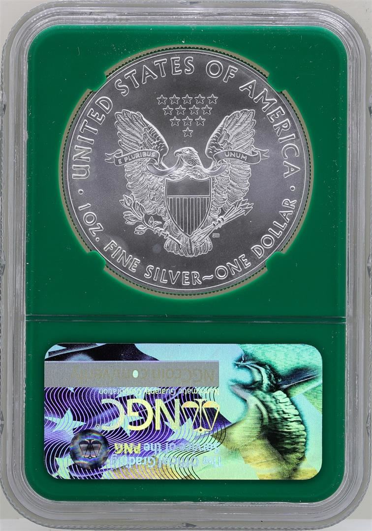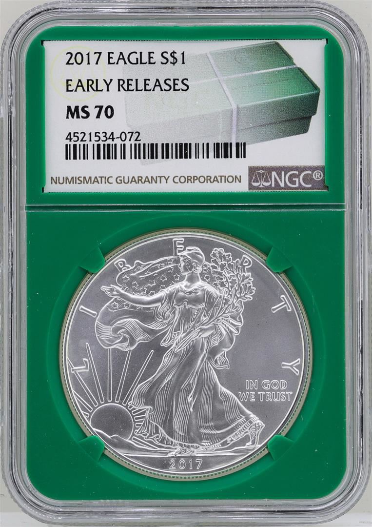 One 2017 $1 American Silver Eagle Coin NGC MS70 Early Releases Green Core. NGC Certified.