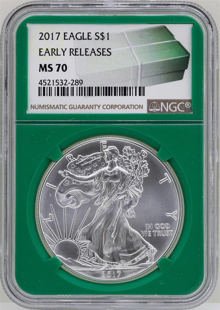 One 2017 $1 American Silver Eagle Coin NGC MS70 Early Releases Green Core. NGC Certified.