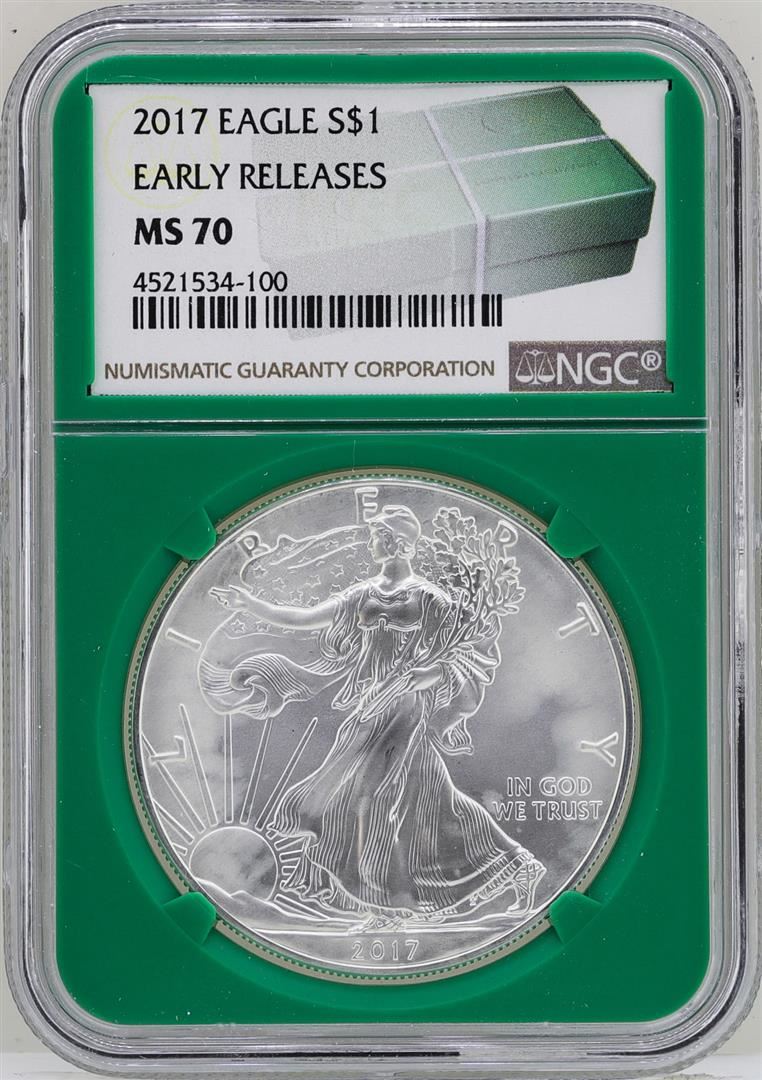 One 2017 $1 American Silver Eagle Coin NGC MS70 Early Releases Green Core. NGC Certified.