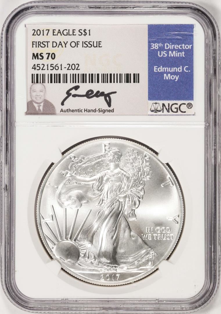 2017 $1 American Silver Eagle Coin NGC MS70 First Day of Issue Edmund Moy Signature