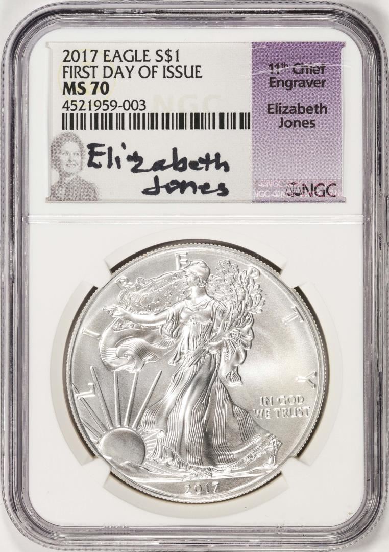 One 2017 $1 American Silver Eagle Coin NGC MS70 First Day of Issue Elizabeth Jones Signed. NGC Certified.