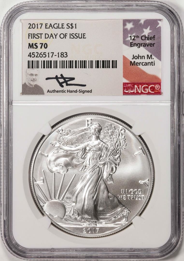 2017 $1 American Silver Eagle Coin NGC MS70 First Day of Issue Mercanti Signed