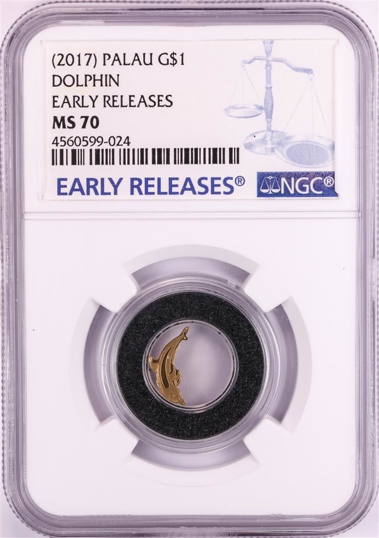 One 2017 $1 Palau Dolphin Gold Coin NGC MS70 Early Releases. NGC Certified.