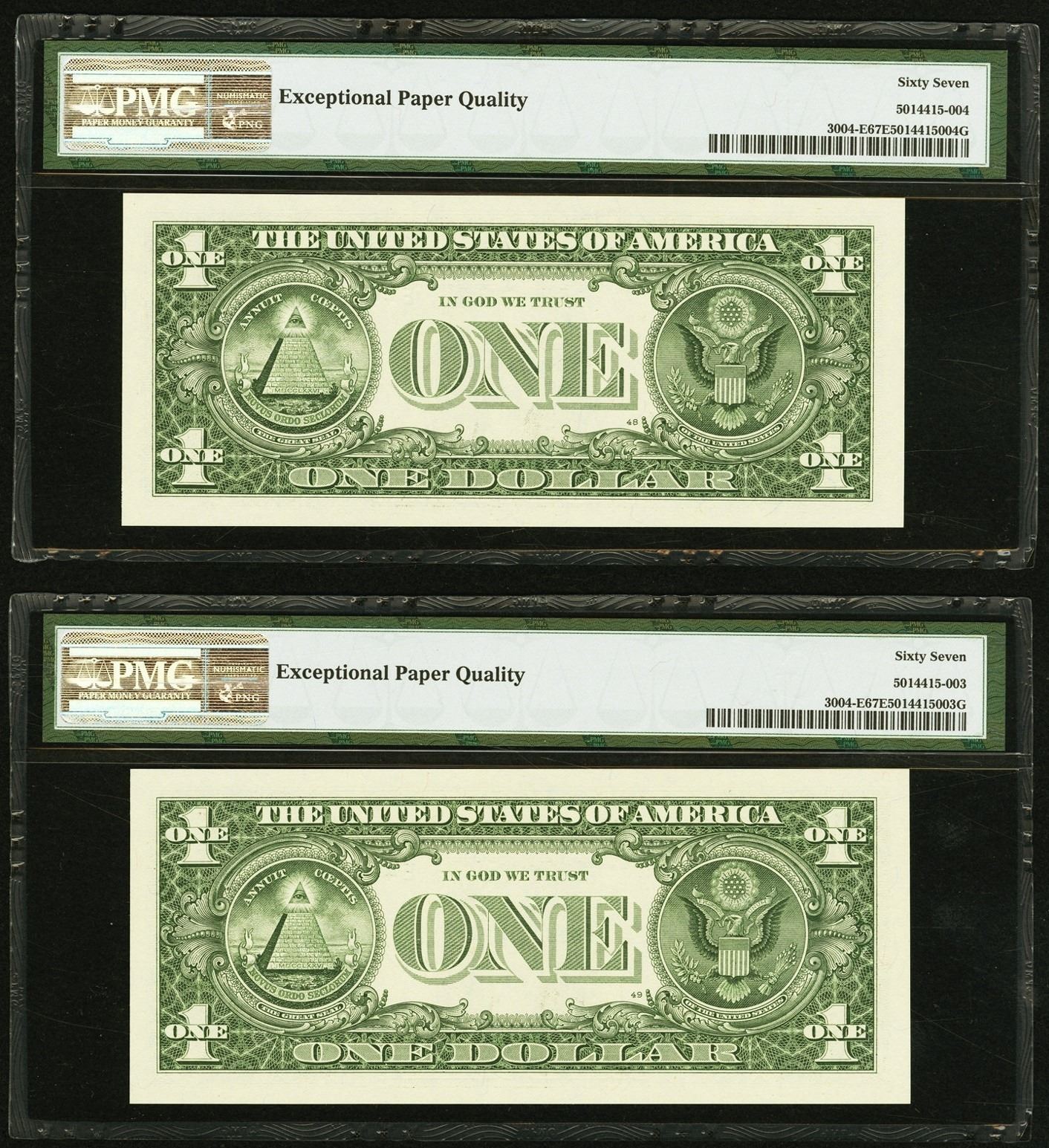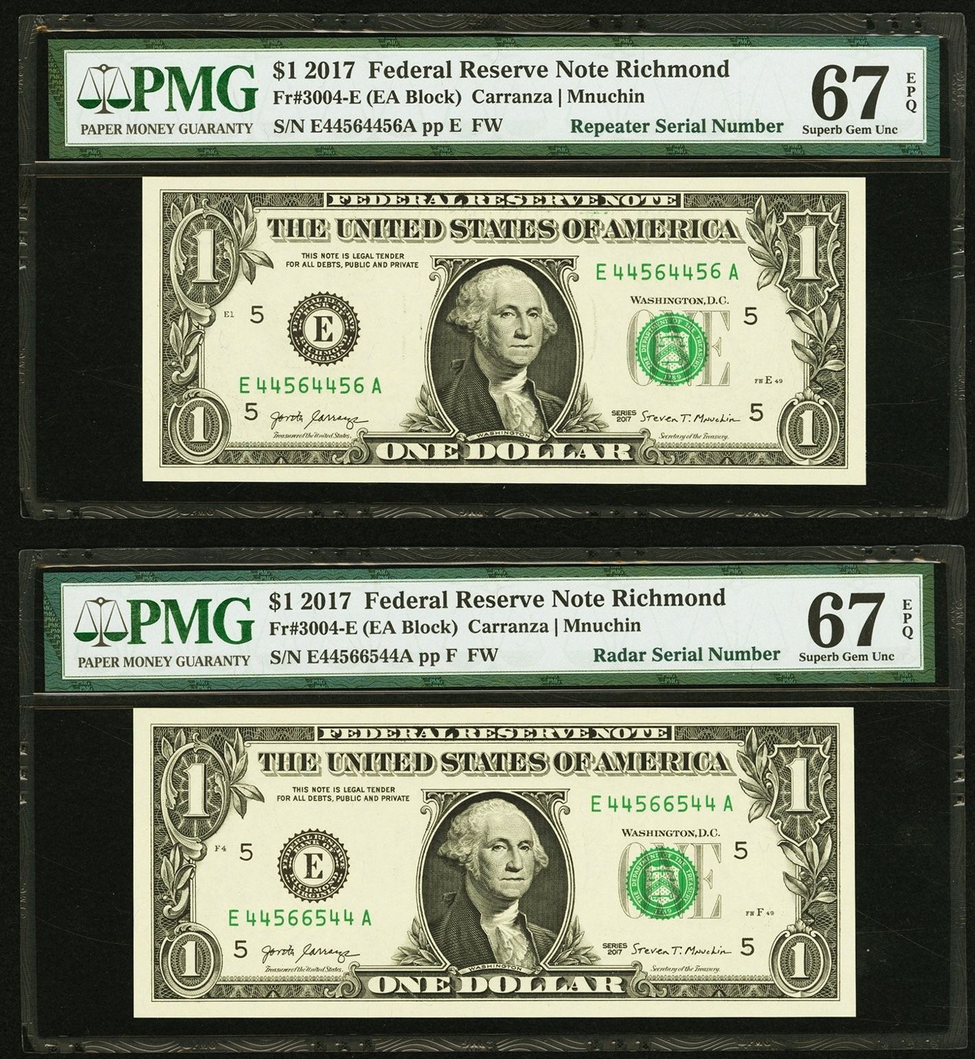 Lot of (2) 2017 $1 Repeater and Radar Serial Richmond Federal Reserve Notes PMG 67EPQ.