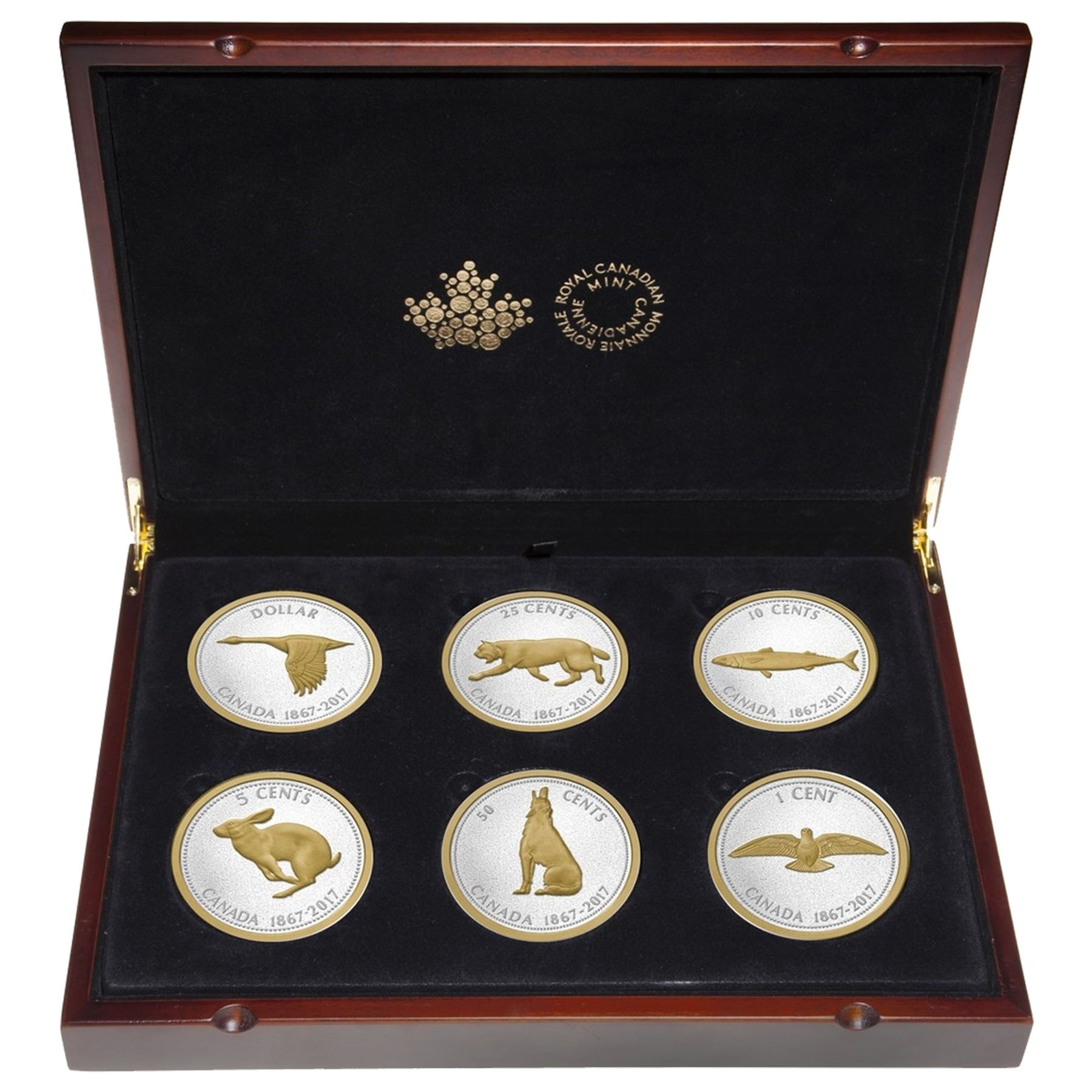 2017 1-cent to $1 Big Coin - Alex Colville Designs 5oz Fine Silver Gold Plated 6-coin Set in Deluxe Display Case (Some capsules may be lightly scratched). Mintage of only 2150 per coin! (TAX Exempt)