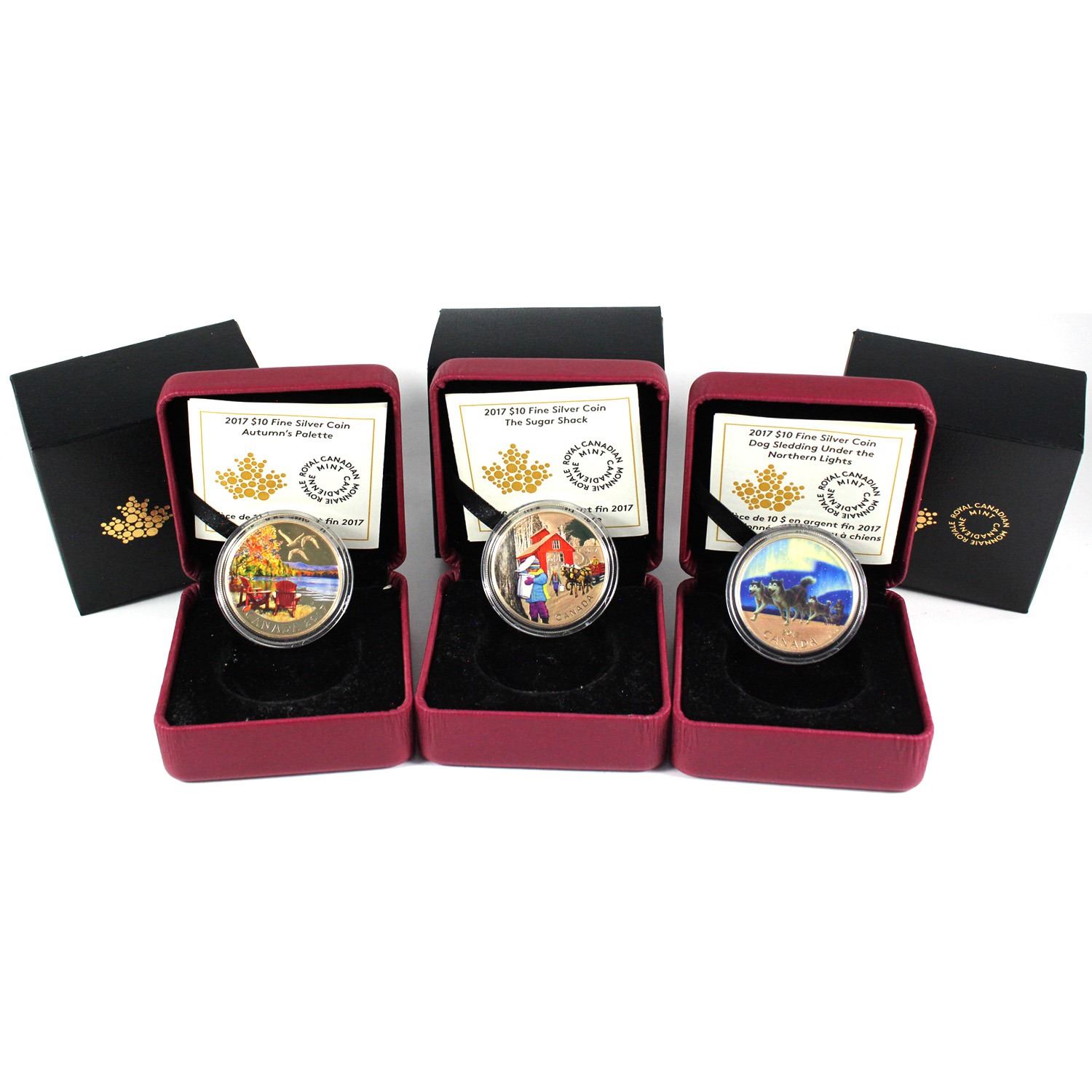 2017 $10 Iconic Canada - The Sugar Shack, Dog Sledding Under the Northern Lights & Autumn's Palette (Coins are toned & capsules scratched). 3pcs (TAX Exempt)