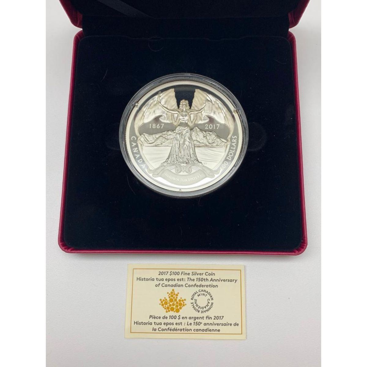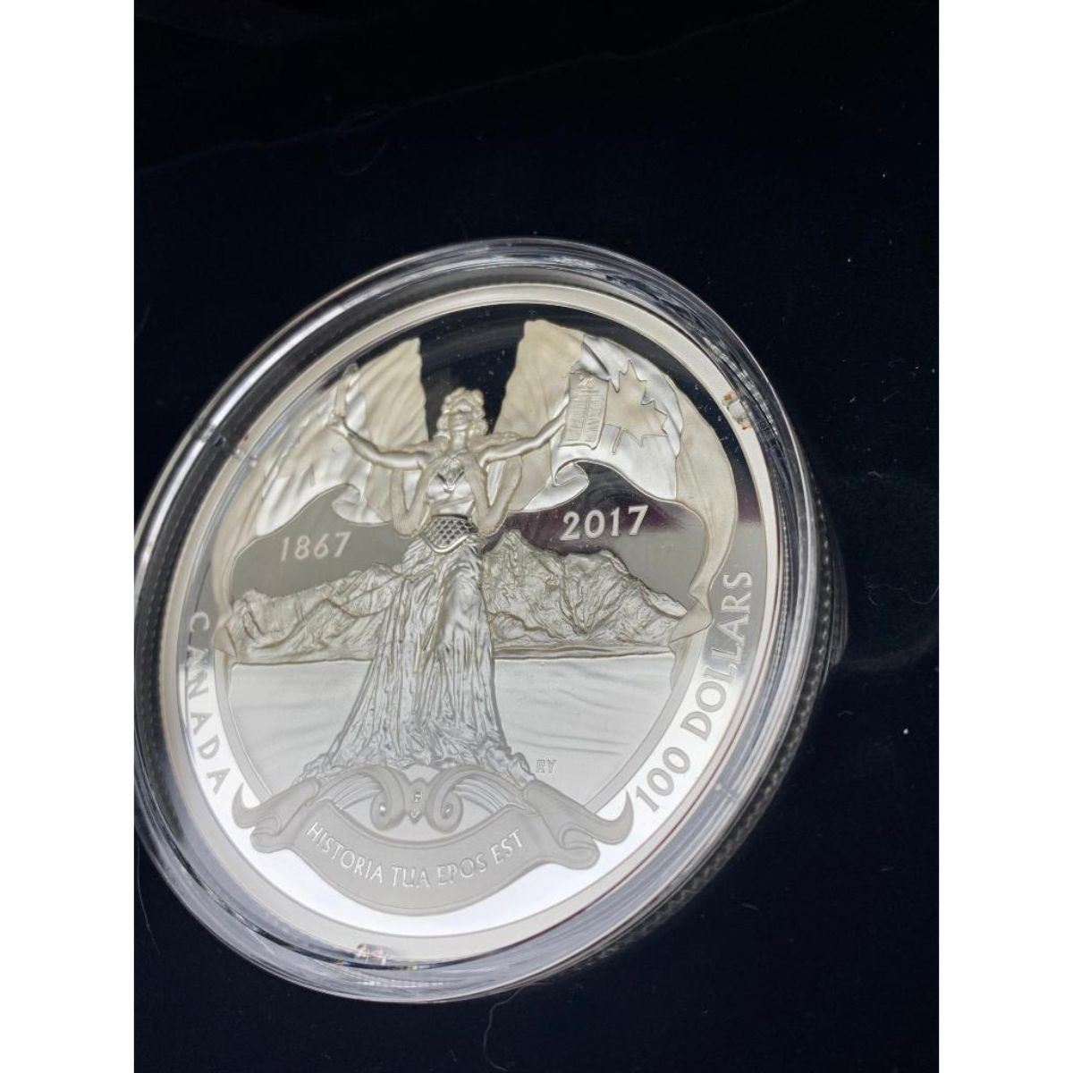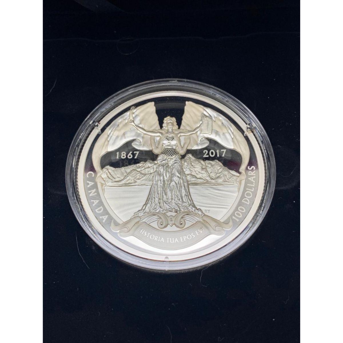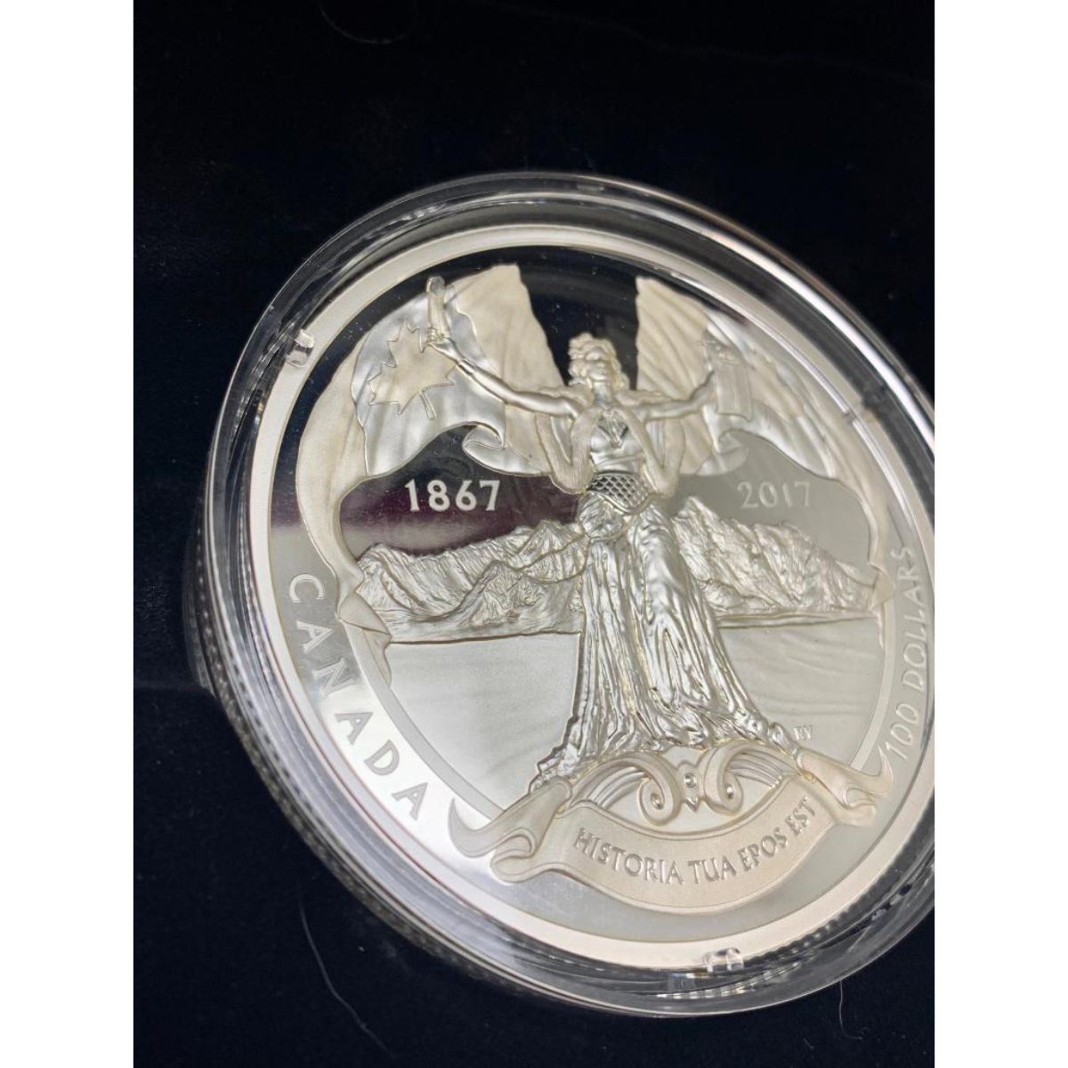 The 150th Anniversary of Canadian Confederation The reverse design is both classic and modern. Centering on an allegorical personification of Canada, the elements represent our story as a nation including historical, geographical, social and political aspects. In the foreground, Canada rises up strong, majestic and bold; she bears a youthful appearance, given Canada's status as a relatively young nation. Canada is the picture of grace and a vision of strength in her protective armour, and yet she carries no weapon—a symbolic representation of our efforts to bring peace throughout the world. Facing out as though looking to the future, Canada's gaze is calm and steady while her arms are open wide, ready to embrace what challenges and triumphs lie ahead. In one hand is a symbolic representation of the British North America Act, which represents the birth of the Dominion of Canada 150 years ago. In the other hand is a single feather that pays tribute to those who helped forge our nation's path: the First Nations peoples and the Fathers of Confederation. A fur cape is a further reminder of First Nations traditions, as well as the importance of the fur trade in Canada's early history. In the background, Mount Logan (Canada's tallest peak) represents the diversity of the land, and alludes to the ability of Canadians to "rise" to the challenges of the past, present and future. This new coin design represents Canada as the country celebrates its milestone 150th anniversary of Confederation. The Latin banner across the bottom reads "Historia tua epos est," which translates to "Your history is an epic," a line which also appears in the French version of "O Canada." In the first 150 years, Canada has seen prosperity and hard times, peace and turmoil, tragedy and triumph, but most of all, at its 150th anniversary of Confederation, it is a mature but still youthful nation with a strong patriotic identity and with a reputation as a strong, innovative, steadfast and hopeful nation. The obverse design for all three coins is new for Canada's 150th Anniversary of Confederation, but also draws on the tradition of the original Confederation medal and the first coins of Canada. While the obverse of the original 1867 medal featured a single effigy of Queen Victoria, the reigning monarch at the time of Confederation, the obverse sides of these new coins feature the dual effigies of Her Majesty Queen Elizabeth II by Susanna Blunt and Queen Victoria by Leonard Charles Wyon. Queen Victoria is featured as the monarch at the time of Confederation in 1867, while Queen Elizabeth II appears as our monarch at the time of "Canada 150." The obverse also includes the cypher used by Her Majesty Queen Elizabeth II, and the cypher that was used by Queen Victoria. Each cypher is ensigned with a crown depicted in a style specifically used by each monarch. • Mintage: 1,000 • Weight: 10 oz fine silver (each) • Diameter: 76.25 mm (each) • GST/HST exempt