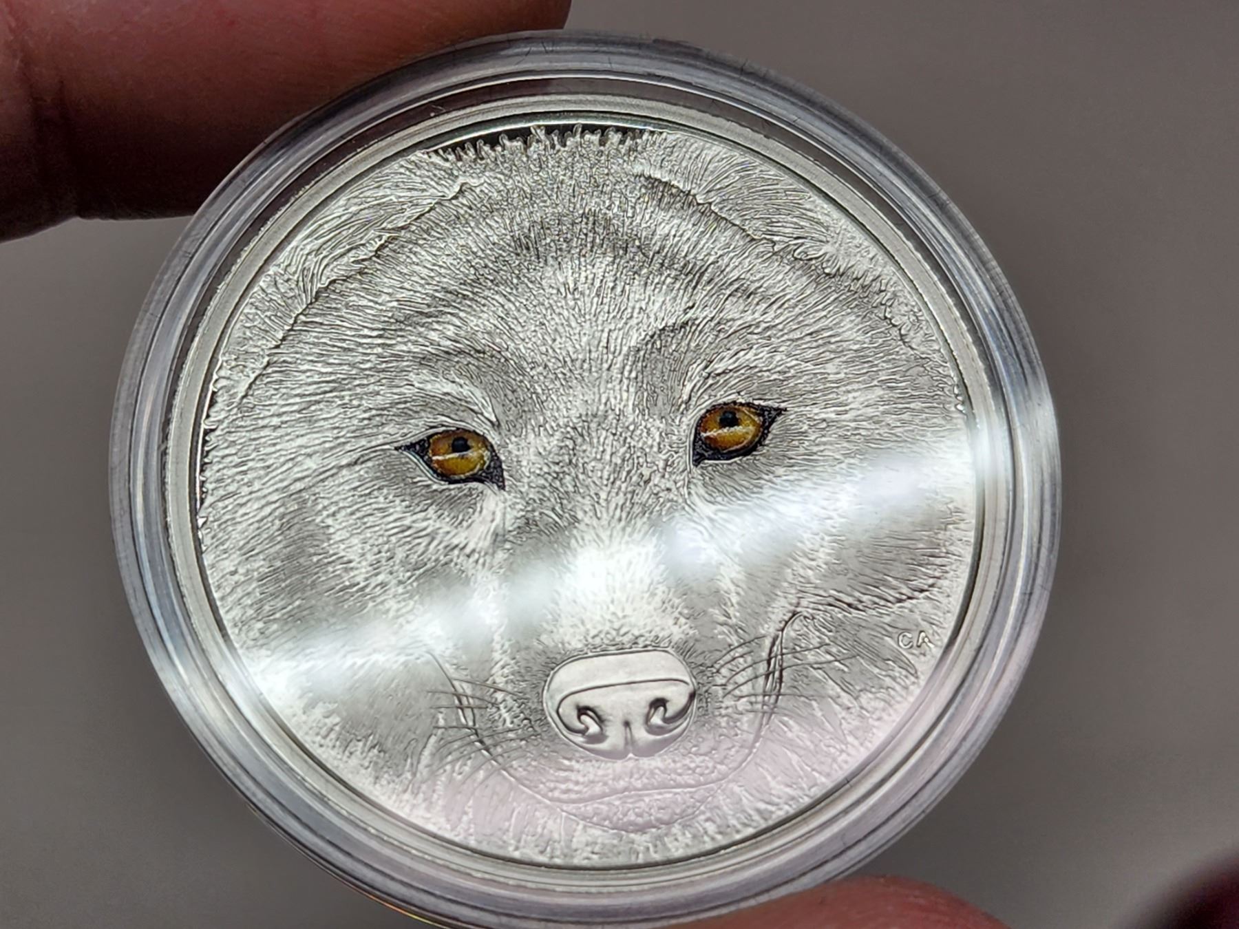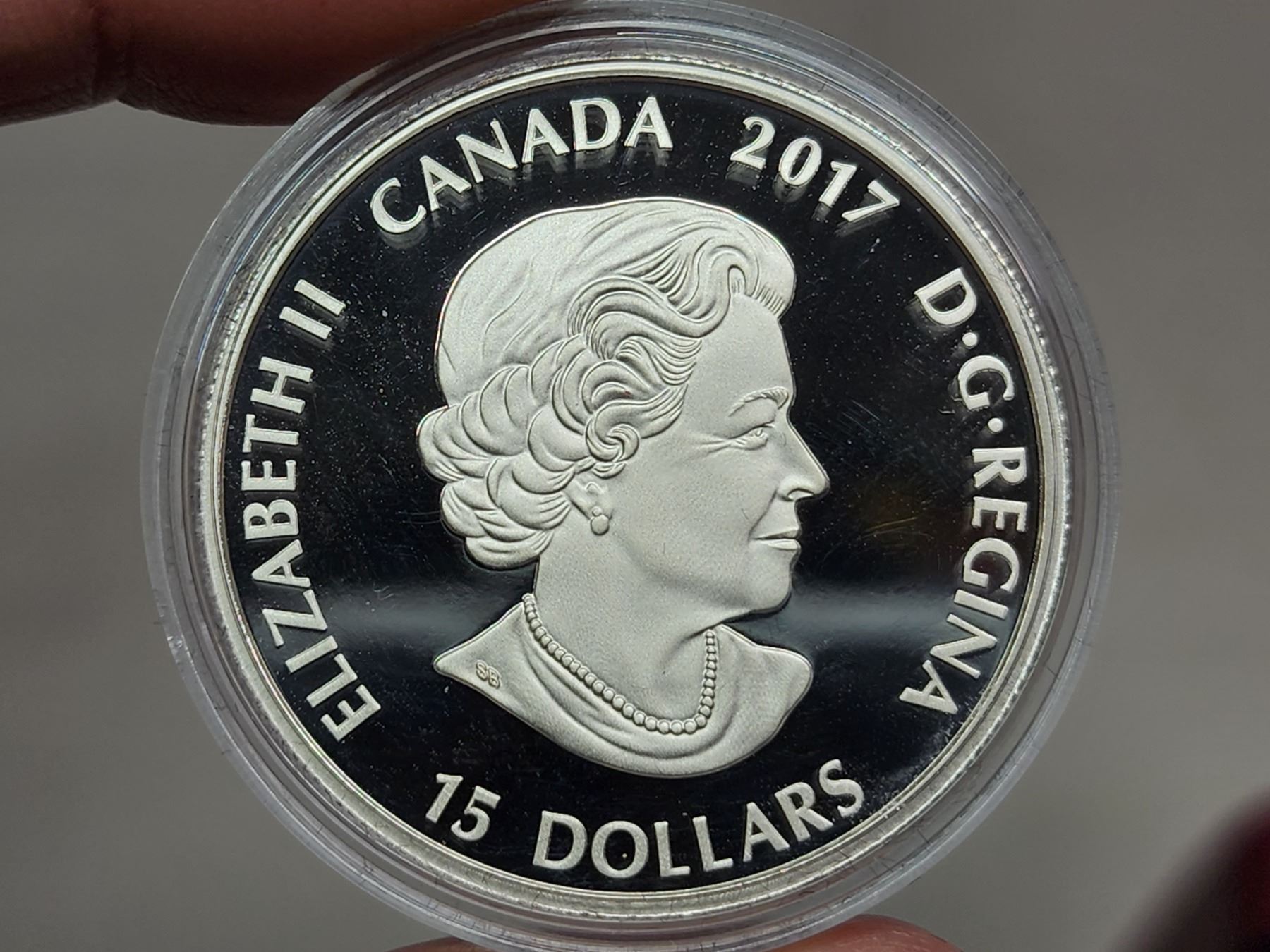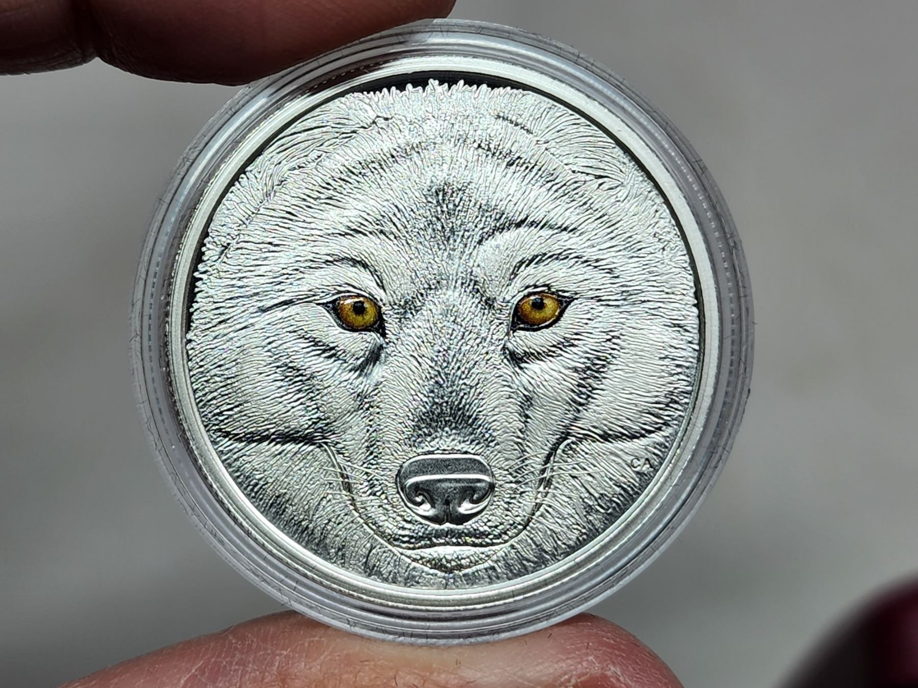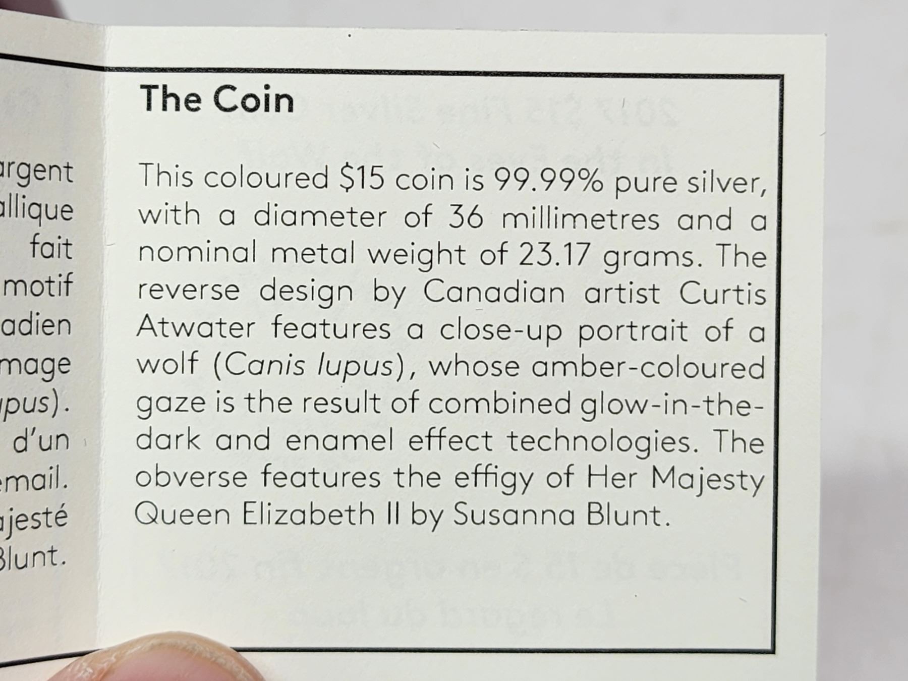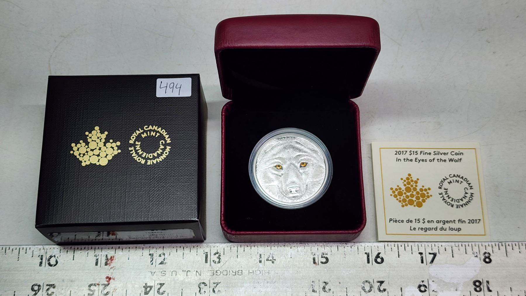 2017 $15 In the Eyes of the Wolf. 99.99% pure Silver. Features glow-in-the dark & enamel effect technologies. Proof. Housed in its original RCM case of issue.