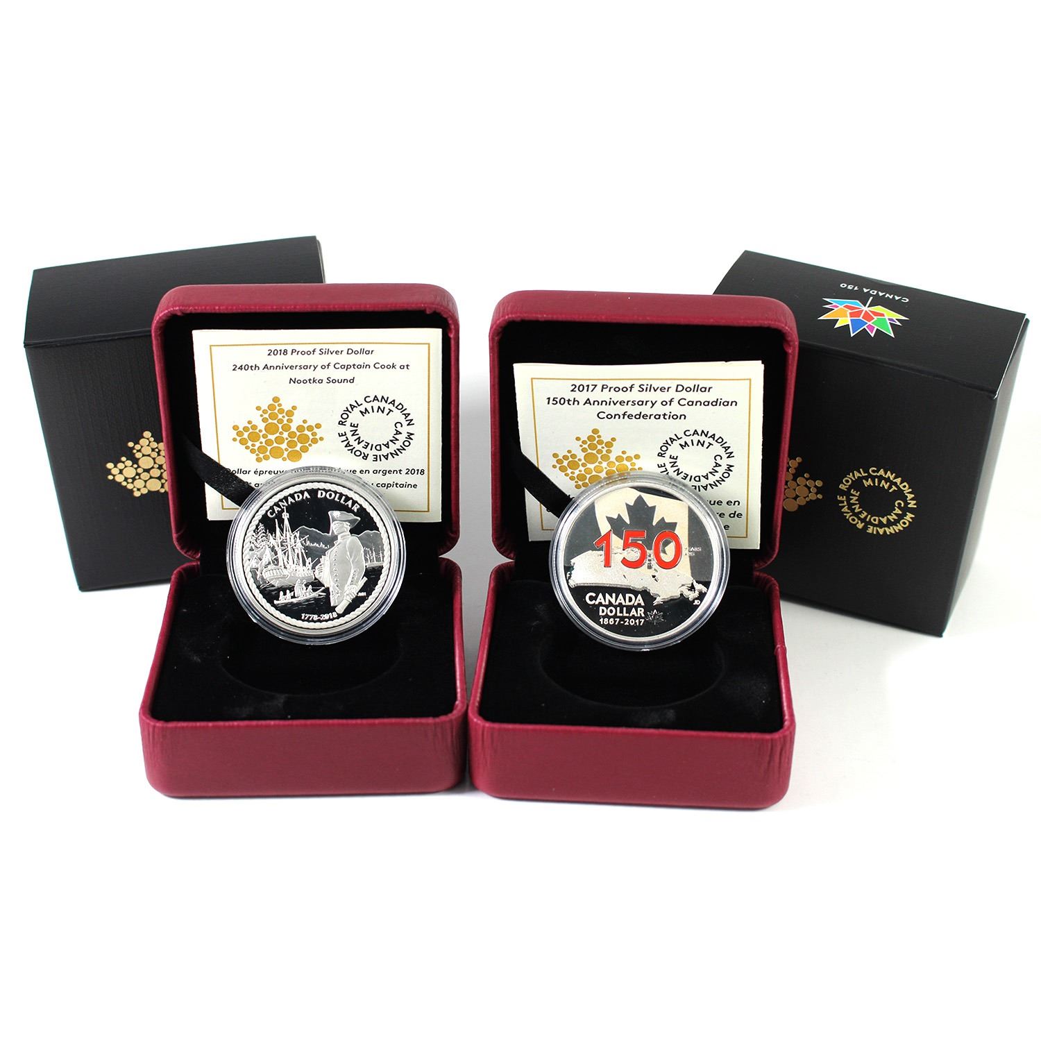 2017 150th Ann. Canada Confederation & 2018 Captain Cook at Nootka Sound Proof Silver Dollars (2007 lightly toned & 2008 capsule lightly scratched). 2pcs (Tax Exempt)