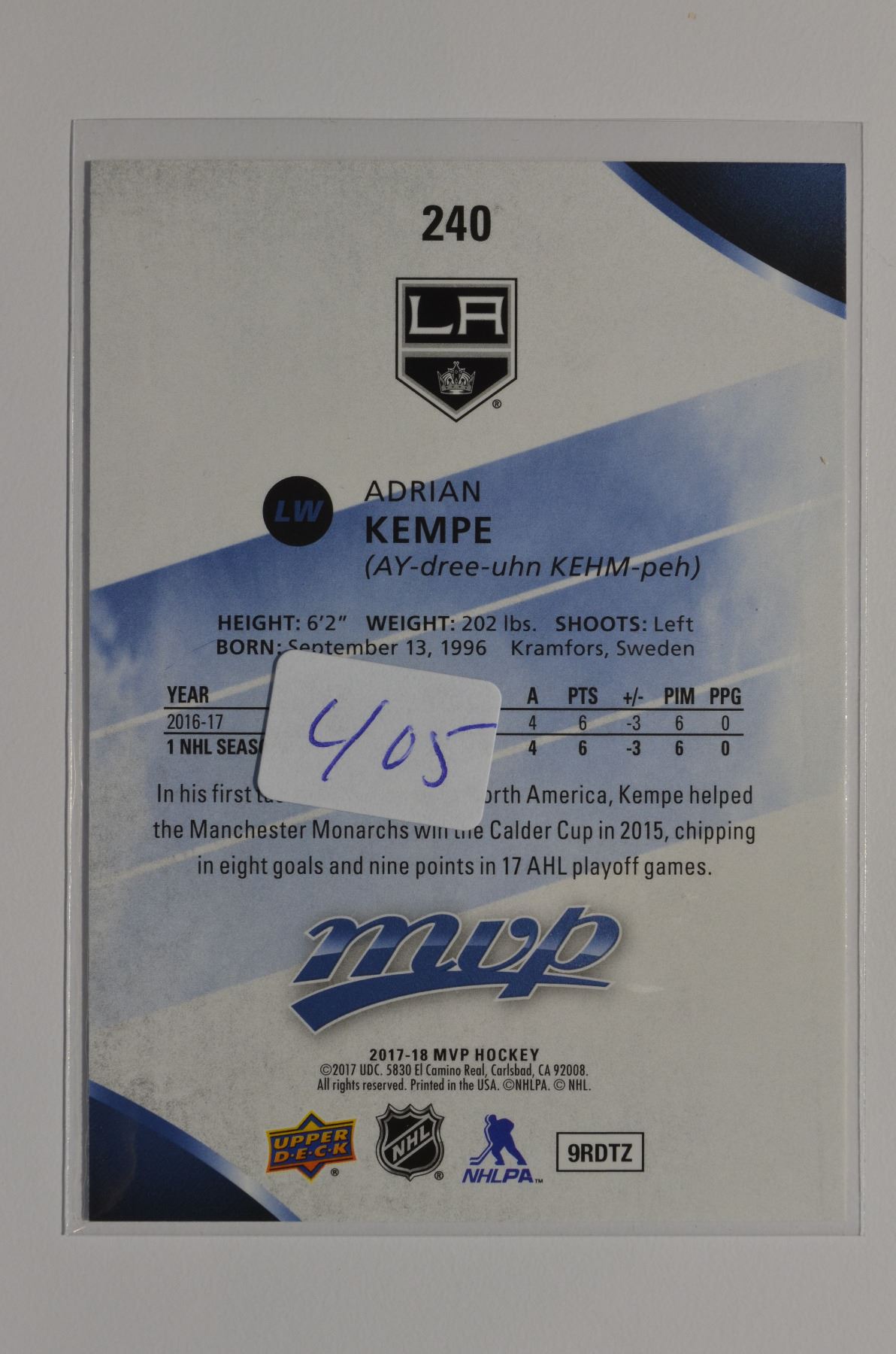 2017-18 Upper Deck MVP #240 Adrian Kempe RC