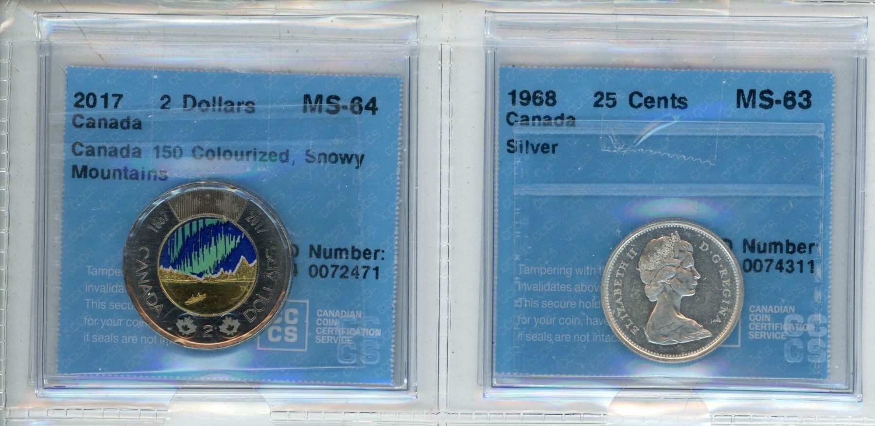 2017 $2 Colourized Snowy Mountain (MS-64) & 1968 .25C (MS-63)