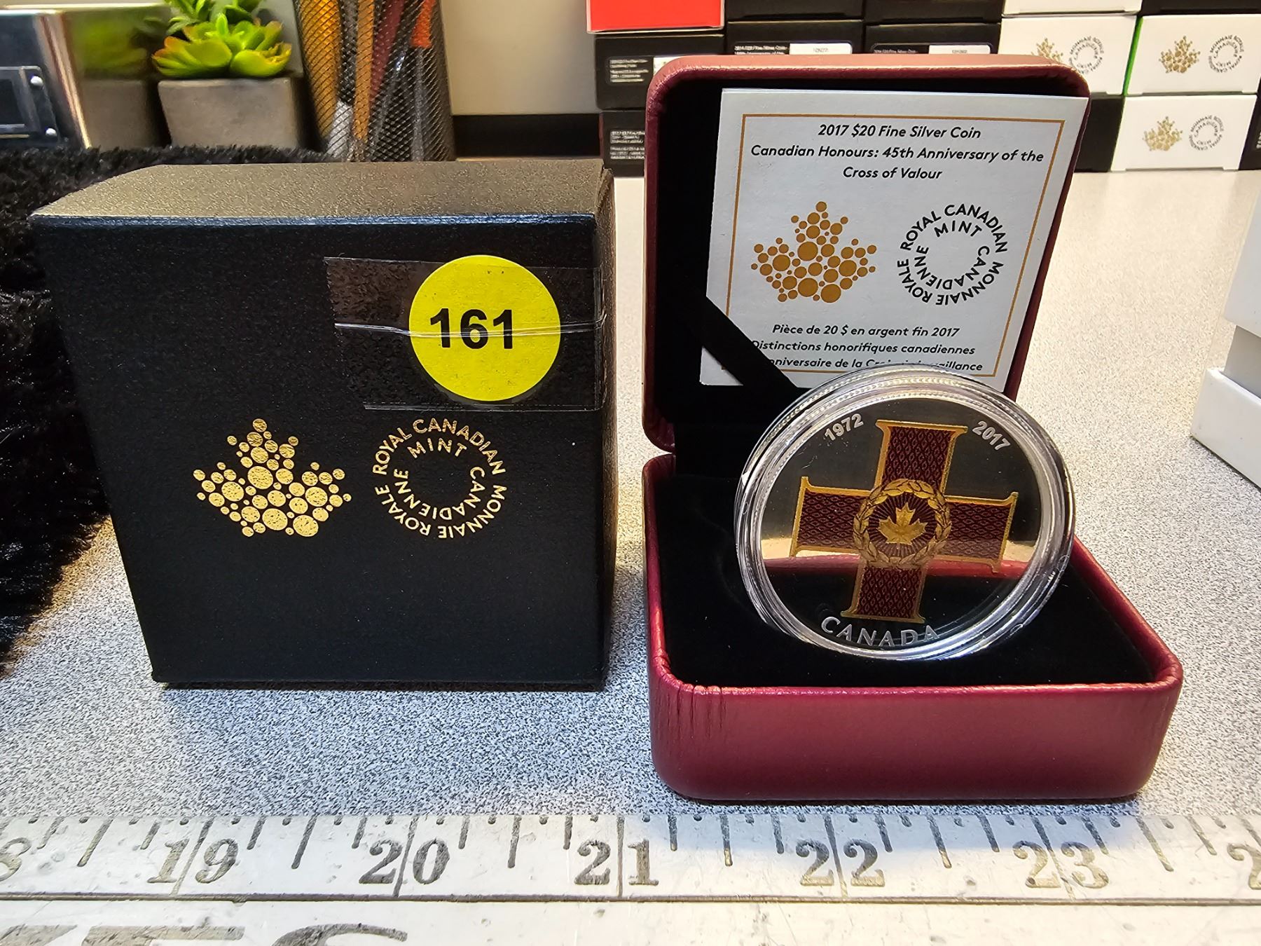 2017 $20 Canadian Honours Series: 45th Anniversary of the Cross of Valour. Colourized. Proof with Ultra Heavy Cameo. 99.99% pure Silver. Housed in its original Royal Canadian Mint case & box of issue, along with a Certificate of Authenticity.