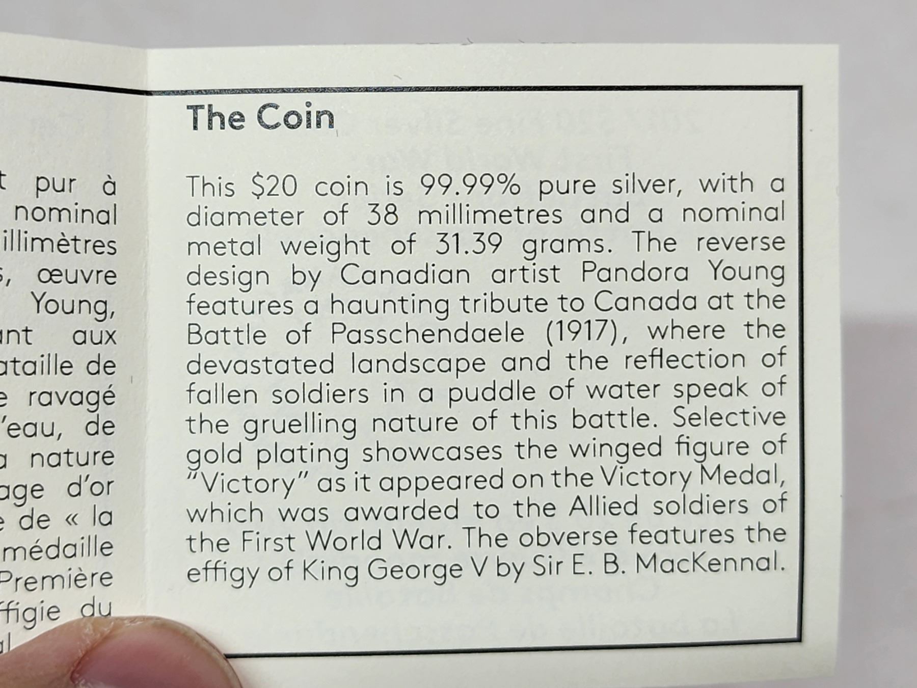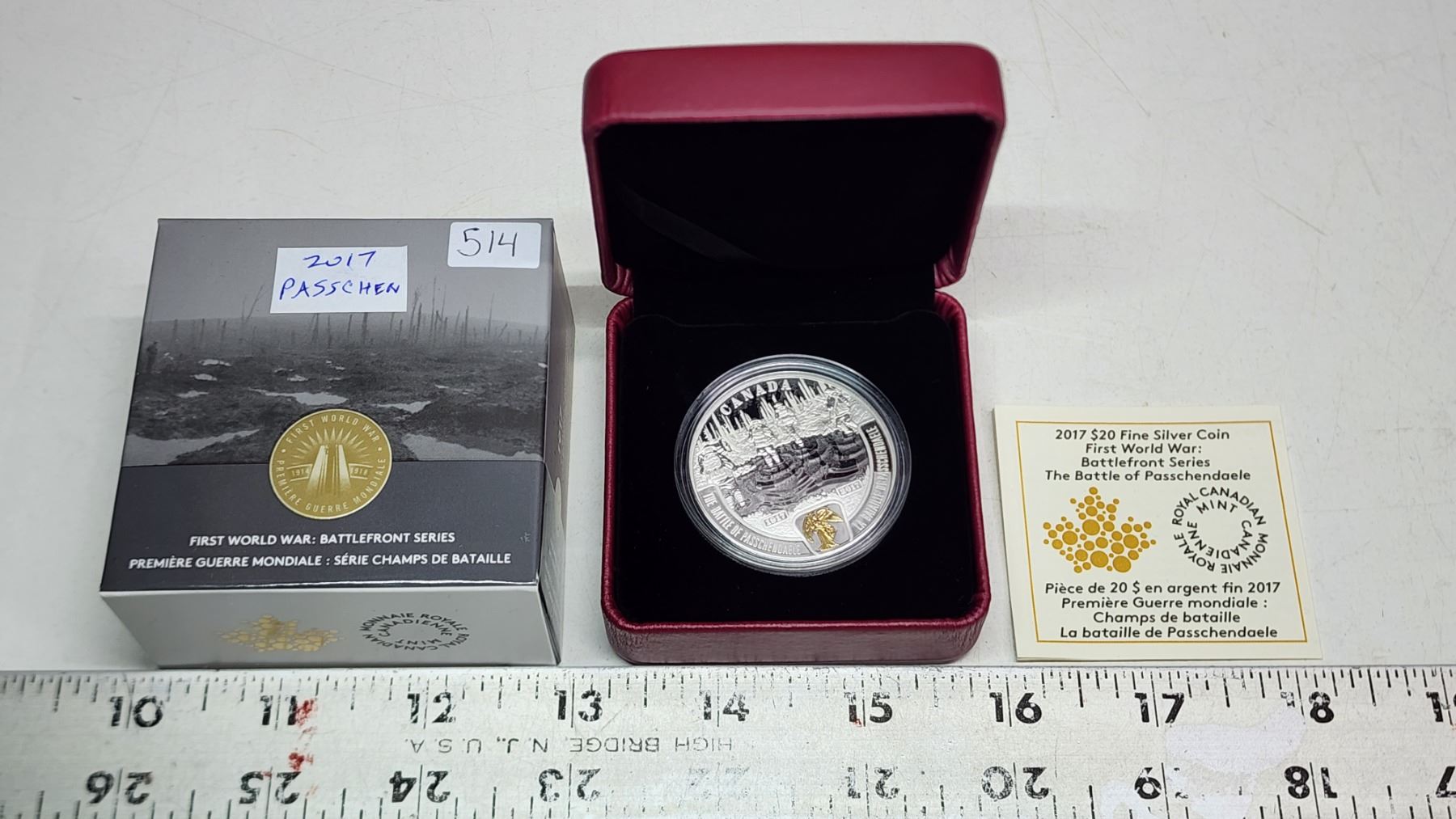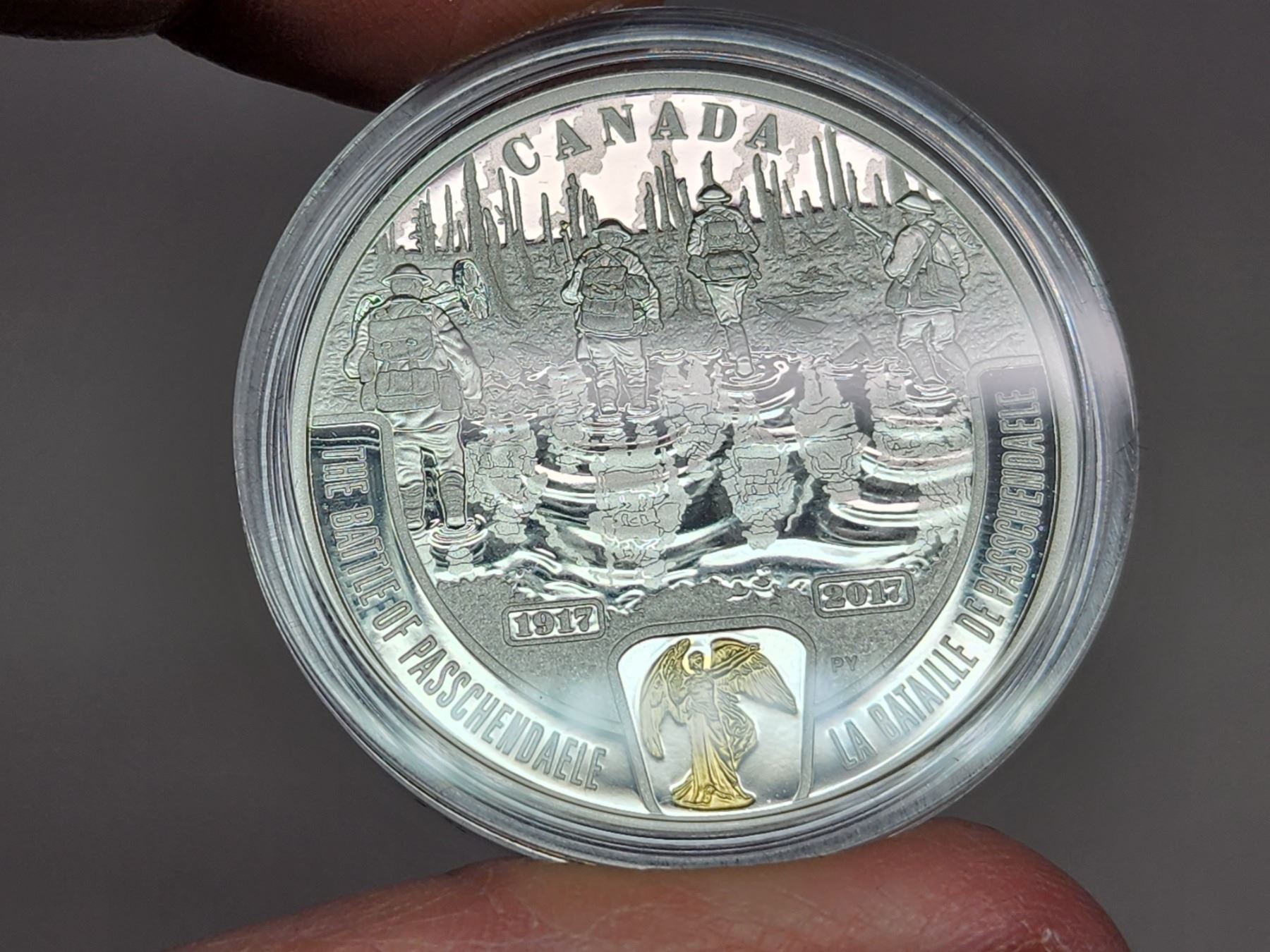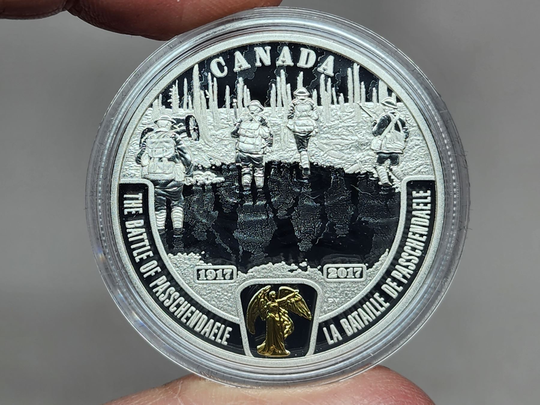 2017 $20 First World War Battlefront Series: The Battle of Passchendaele. 99.99% pure Silver. Gold Plating on Victory. Proof. Housed in its original RCM case & box of issue.