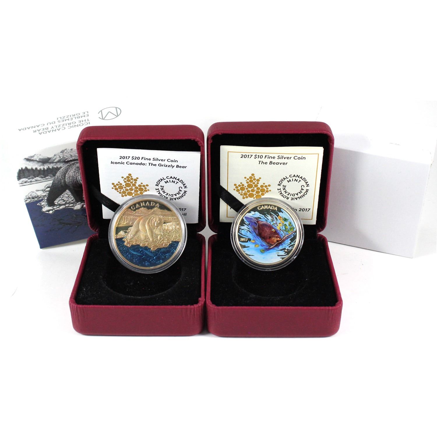2017 $20 Iconic Canada - The Grizzly Bear & $10 The Beaver (Coins are toned & grizzly capsule lightly scratched). 2pcs (TAX Exempt)