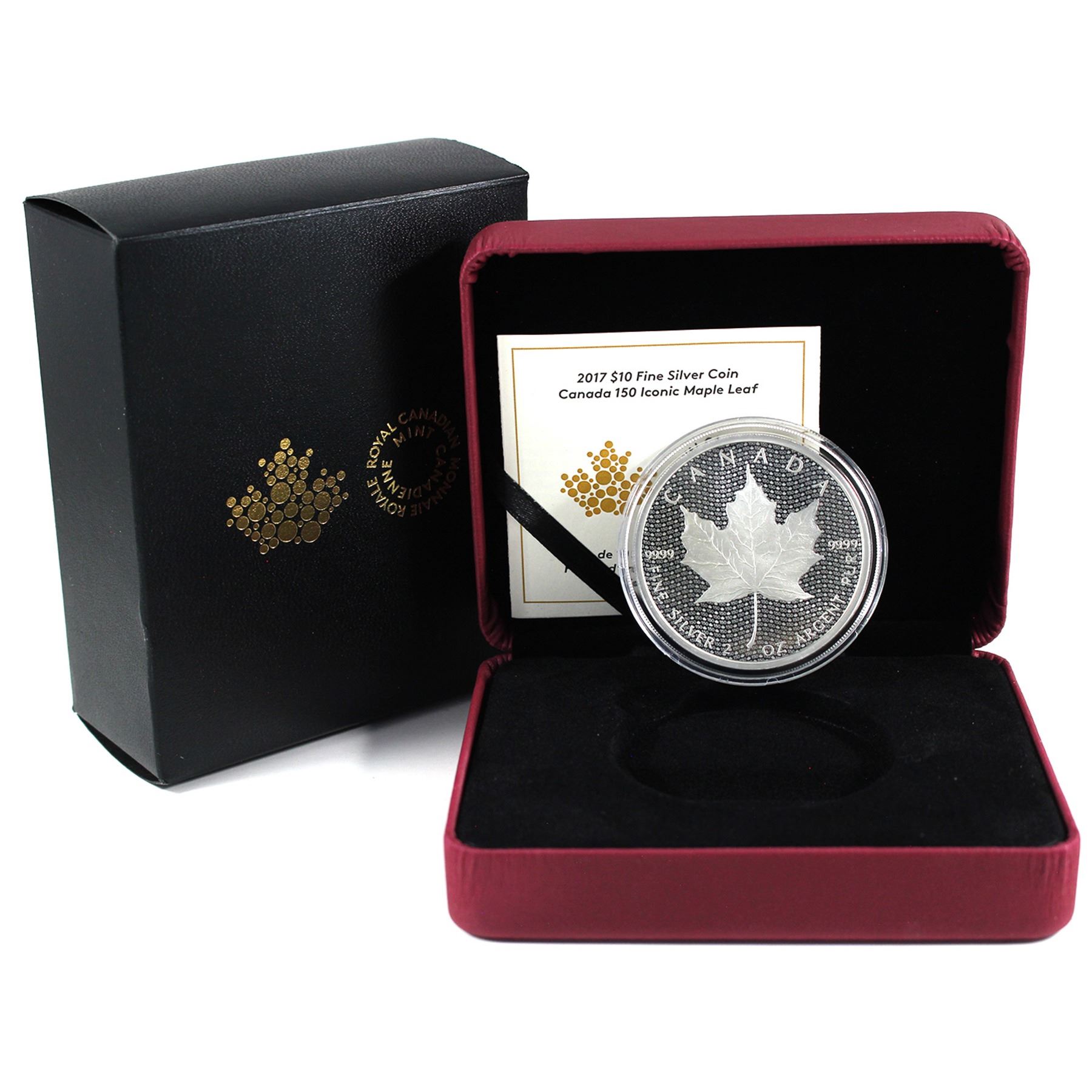 2017 $20 Iconic Maple Leaf, Fine Silver. Mintage of 6000. Natural soft gold toning. Small dent at corner of clamshell case. (Tax Exempt)