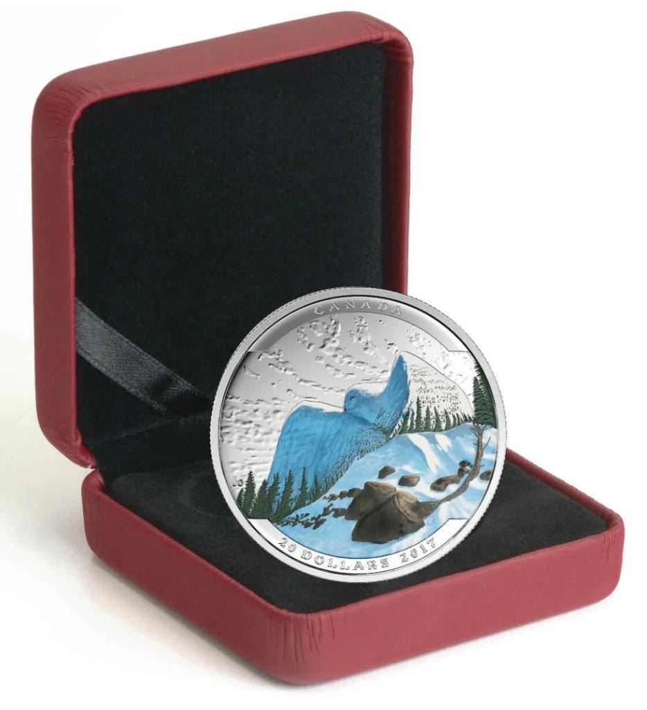 2017 $20 Landscape Illusion: Snowy Owl - Pure Silver Coin -This fascinating 2017 colour $20 ultra low mintage coin showcases the art of illusion and brings you two images for the price of one.¾ It features a stunning Canadian landscape together with an optical illusion of wildlife.¾ The coin weighs just over one ounce of pure silver. This coin features an image of Canadian landscape with an optical illusion of a snowy owl. The mintage is extremely low at just 5,500. As pure silver coins issued by the Royal Canadian Mint, this item is HST/GST exempt.