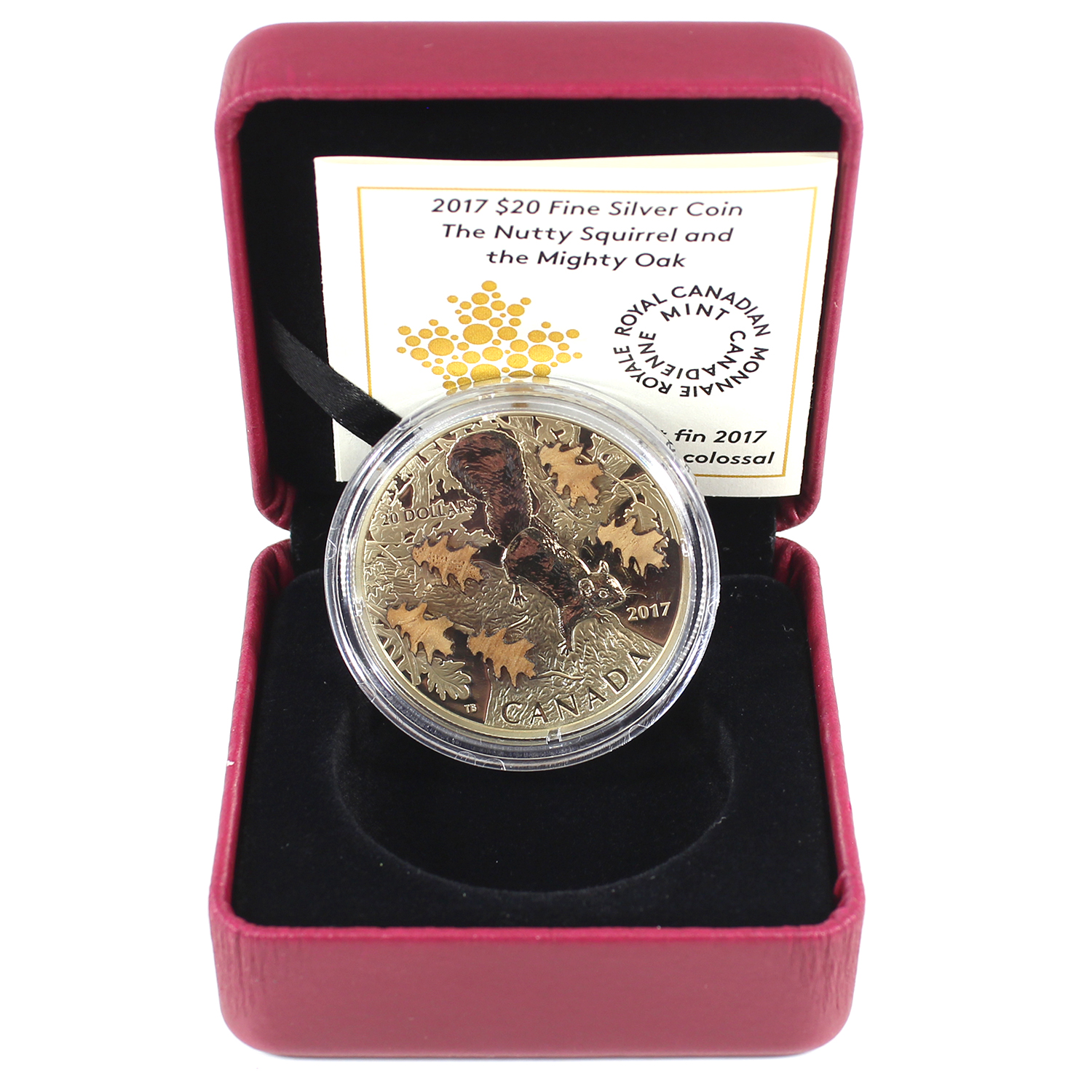 Coin is 1oz and .9999 fine with laser cut oak tree leaf wooden embellishments. Coin has been toned a subtle gold, more so on the reverse. No outer box.