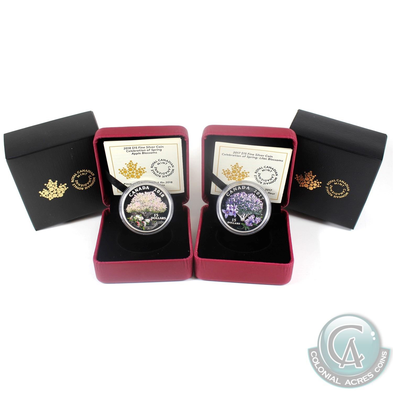 2017 & 2018 Canada $15 Celebration of Spring Fine Silver Coins - 2017 Lilac Blossoms & 2018 Apple Blossoms (2018 capsule is lightly scuffed). 2pcs (TAX Exempt)
