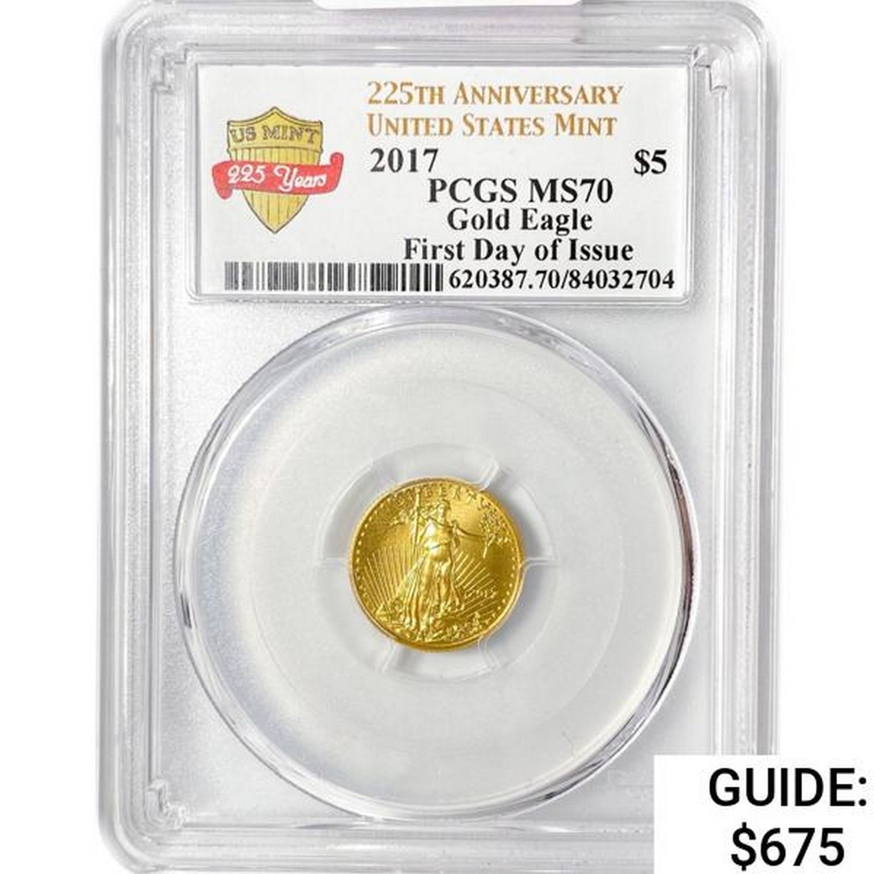 2017 $5 1/10oz AGE PCGS MS70 1st Day, 225th Ann