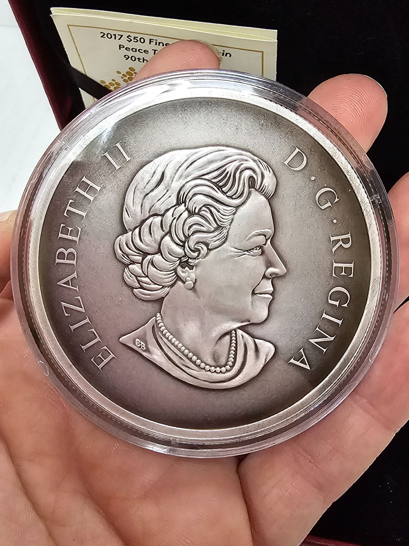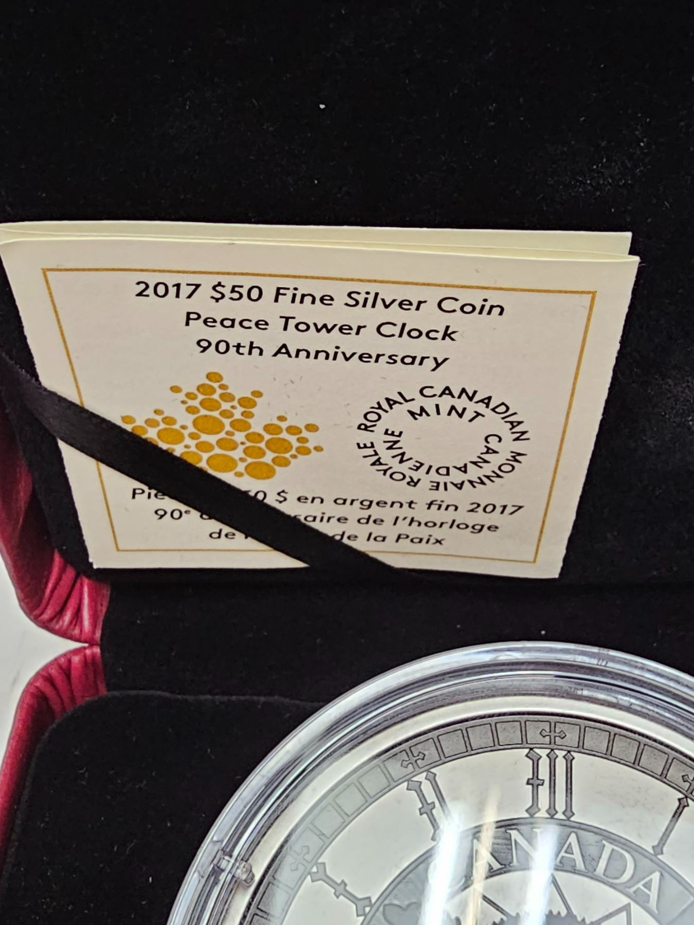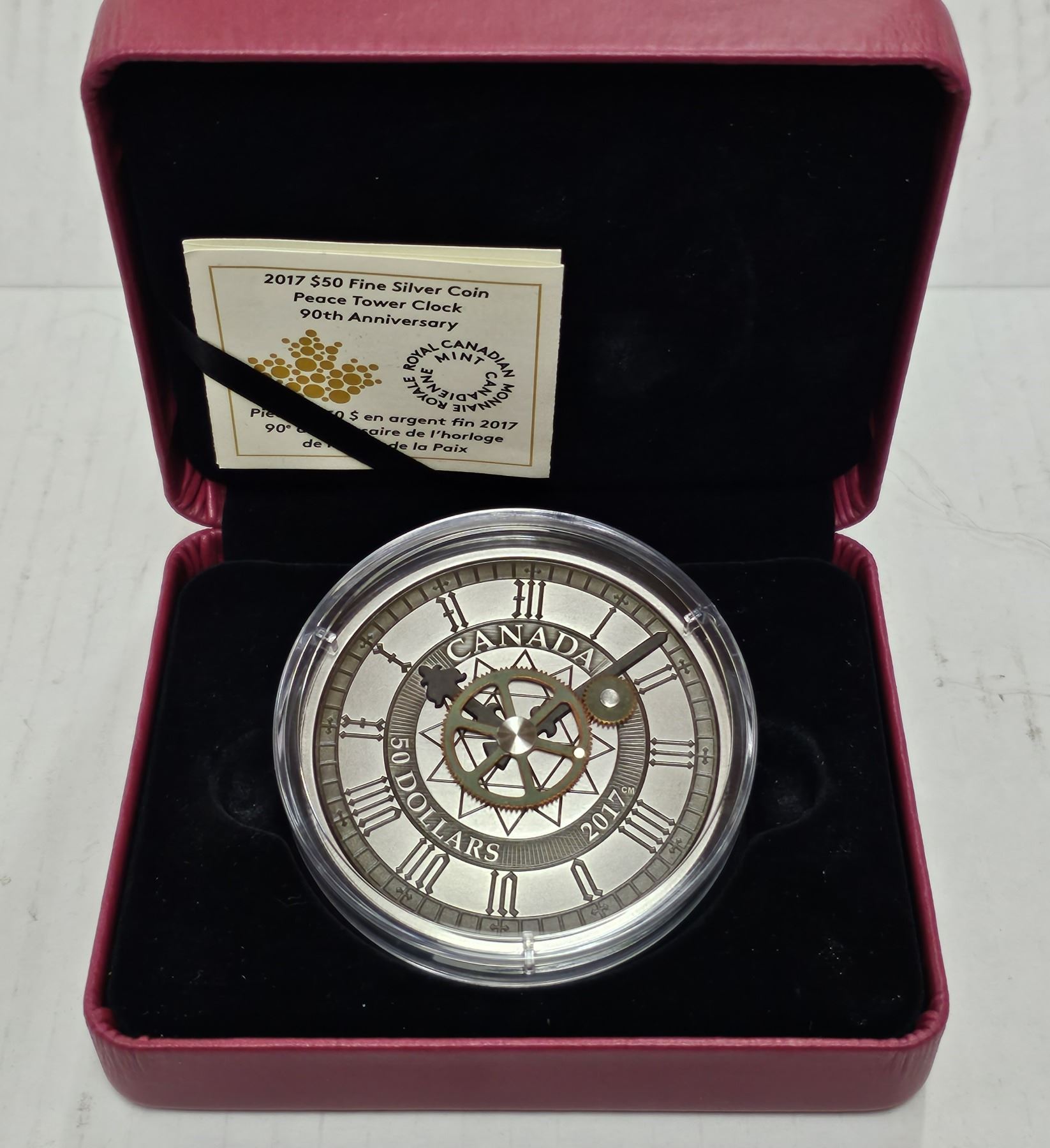 2017 $50 Peace Tower Clock. 90th Anniversary of this iconic clock. The 2 gears are crafted from copper that once clad the roofs of Canada’s Parliament Buildings. Massive coin. Antique Finish. 99.99% pure Silver. Housed in its original Royal Canadian Mint case plus Certificate of Authenticity. Only 1200 minted.