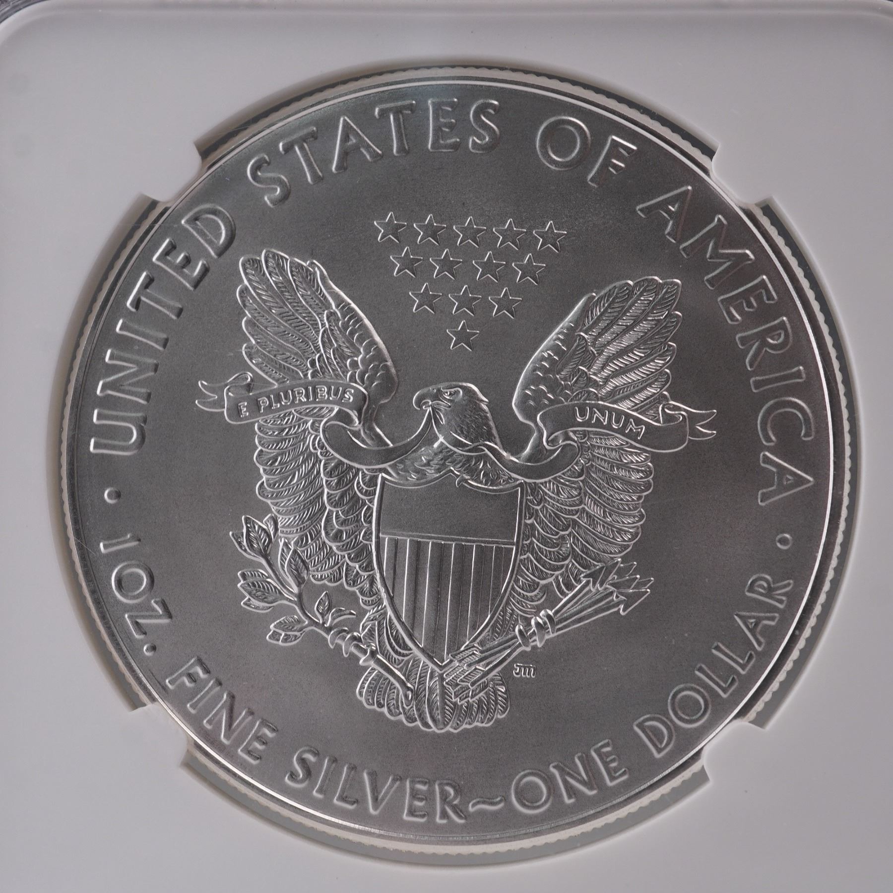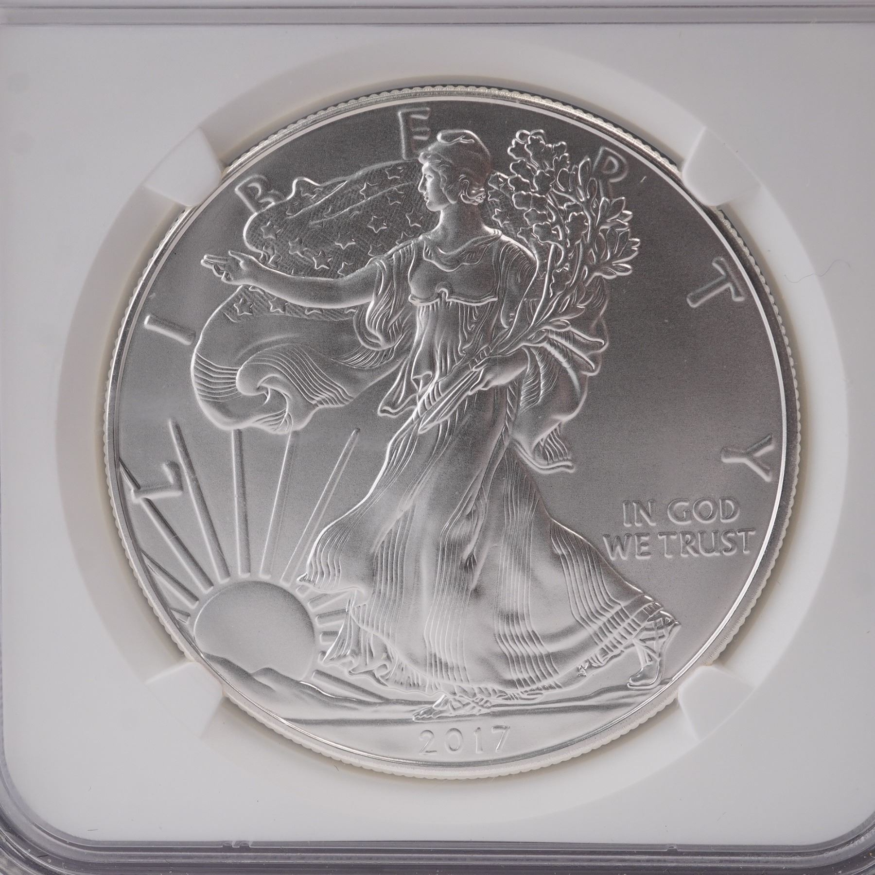 A 2017 American Silver Eagle one-dollar coin struck in one troy ounce of .999 fine silver, and certified by Numismatic Guaranty Corporation (NGC) as Mint State 70. The obverse features Adolph A. Weinman's timeless 1916 Walking Liberty design, depicting Liberty in full stride toward a rising sun, draped in the American flag, with her right arm extended in greeting and her left hand bearing branches of laurel and oak. The scene is encircled by the inscription LIBERTY, flanked by IN GOD WE TRUST at right, and dated 2017 at the base. The reverse, designed by 12th Chief Engraver John Mercanti, portrays a bold heraldic eagle with a shield on its breast, grasping arrows in its left talon and an olive branch in its right, with a ribbon inscribed E PLURIBUS UNUM flowing from its beak and thirteen stars above; representing the original colonies. Housed in a graded NGC slab for further preservation and authentication. Slab measures: 2.25"L x 0.25"W x 3.25"H. Coin diameter: 40.6 mm.