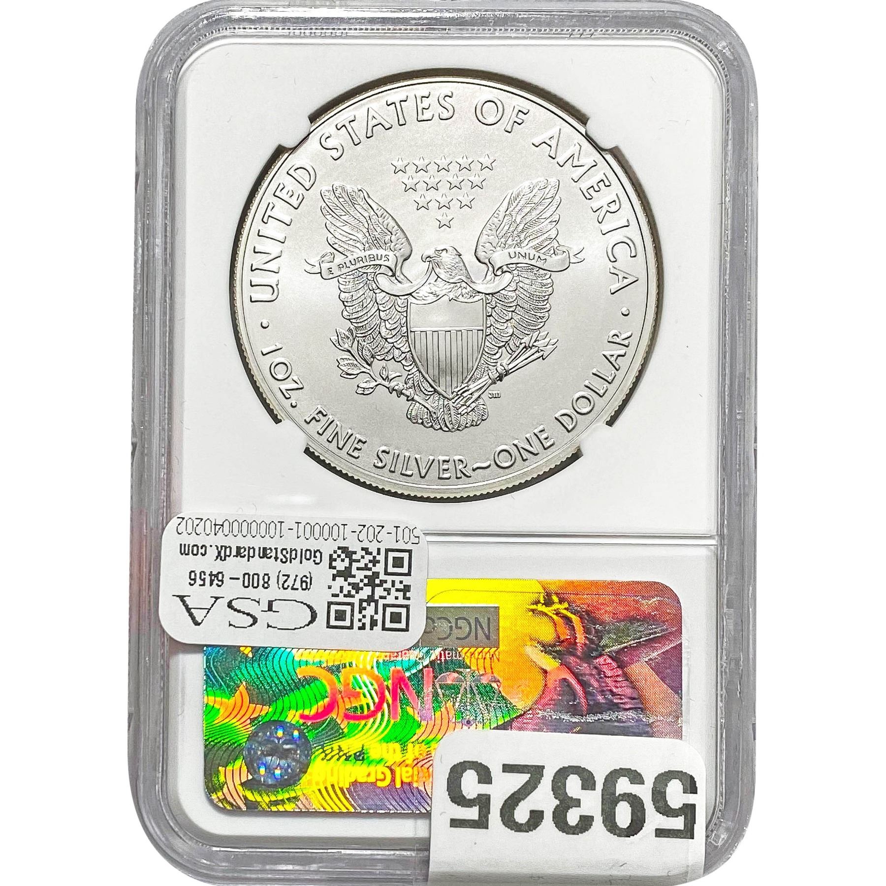 e. Coins sold referencing a third-party grading service are sold “AS IS” without any express or implied warranty, except for a guarantee by GSA that they are genuine. Removal or alteration of the holder, voids all of Bidder’s claims concerning that Product. Certain warranties may be available from the grading services and Bidders are referred to them for further details: Numismatic Guaranty Corporation (NGC), PO Box 4776, Sarasota, FL 34230, www.ngccoin.com/services/writtenguarantee.asp; Professional Coin Grading Services (PCGS), PO Box 9458, Newport Beach, CA 92658, www.pcgs.com/guarantee.html; ANACS, 6555 S. Kenton St., Ste. 303, Englewood, CO 80111; and Independent Coin Grading Co. (ICG), 7901 East Bellview, Ave., Suite 50, Englewood, CO 80111.